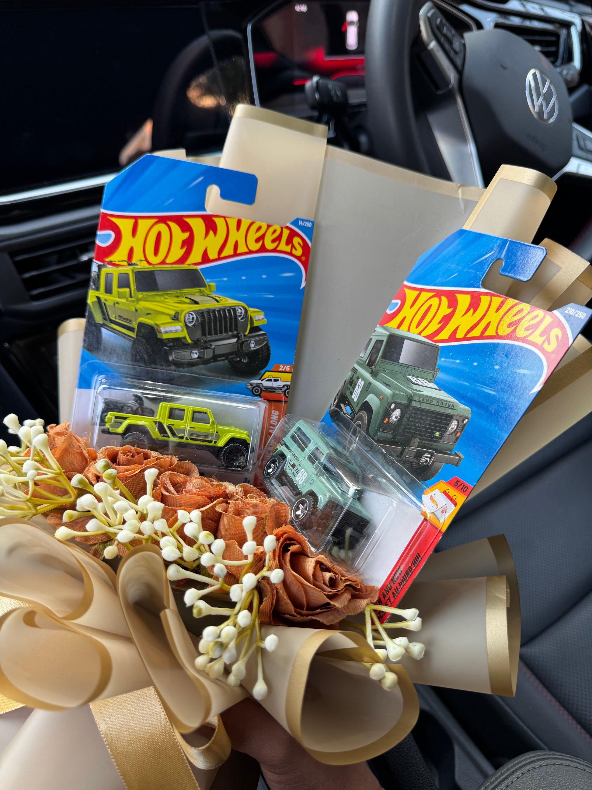 The Hot Wheels 20 Jeep Gladiator & Land Rover Defender 90 Bouquet is a premium gifting concept crafted especially for Hot Wheels collectors, adventure vehicle enthusiasts, and those who appreciate unique, display-ready presents. This handcrafted bouquet features two packaged Hot Wheels cars — the 20 Jeep Gladiator and the Land Rover Defender 90— arranged at the top in a fan-style display. The bouquet is styled with rust-brown artificial roses and white floral buds, wrapped in matte beige and golden wrapping sheets, and tied with a gold satin ribbon for a refined, premium presentation.