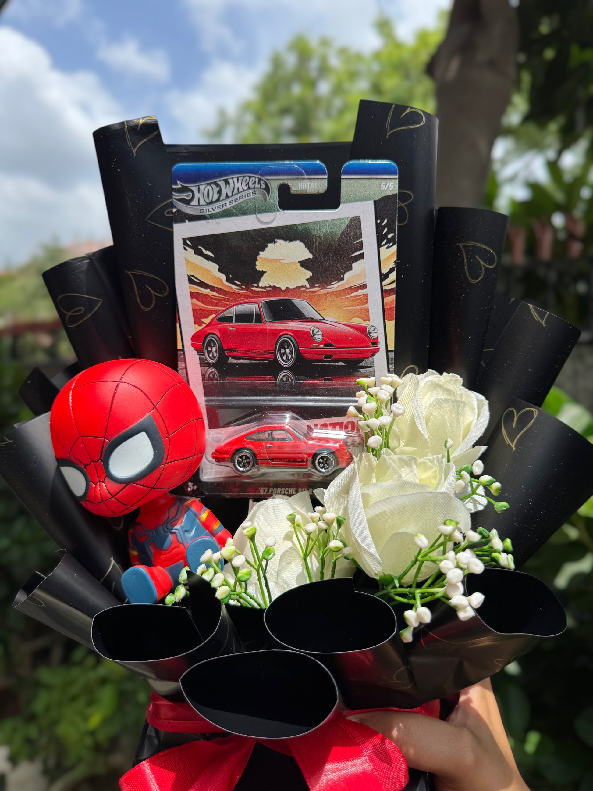 Unleash the power of superheroes and supercars with our exclusive Spider-Man Porsche 911 Hot Wheels bouquet. Wrapped in a bold black sheet design and decorated with elegant white artificial roses, this bouquet blends the thrill of Marvel’s Spider-Man with the timeless speed of the Porsche 911.