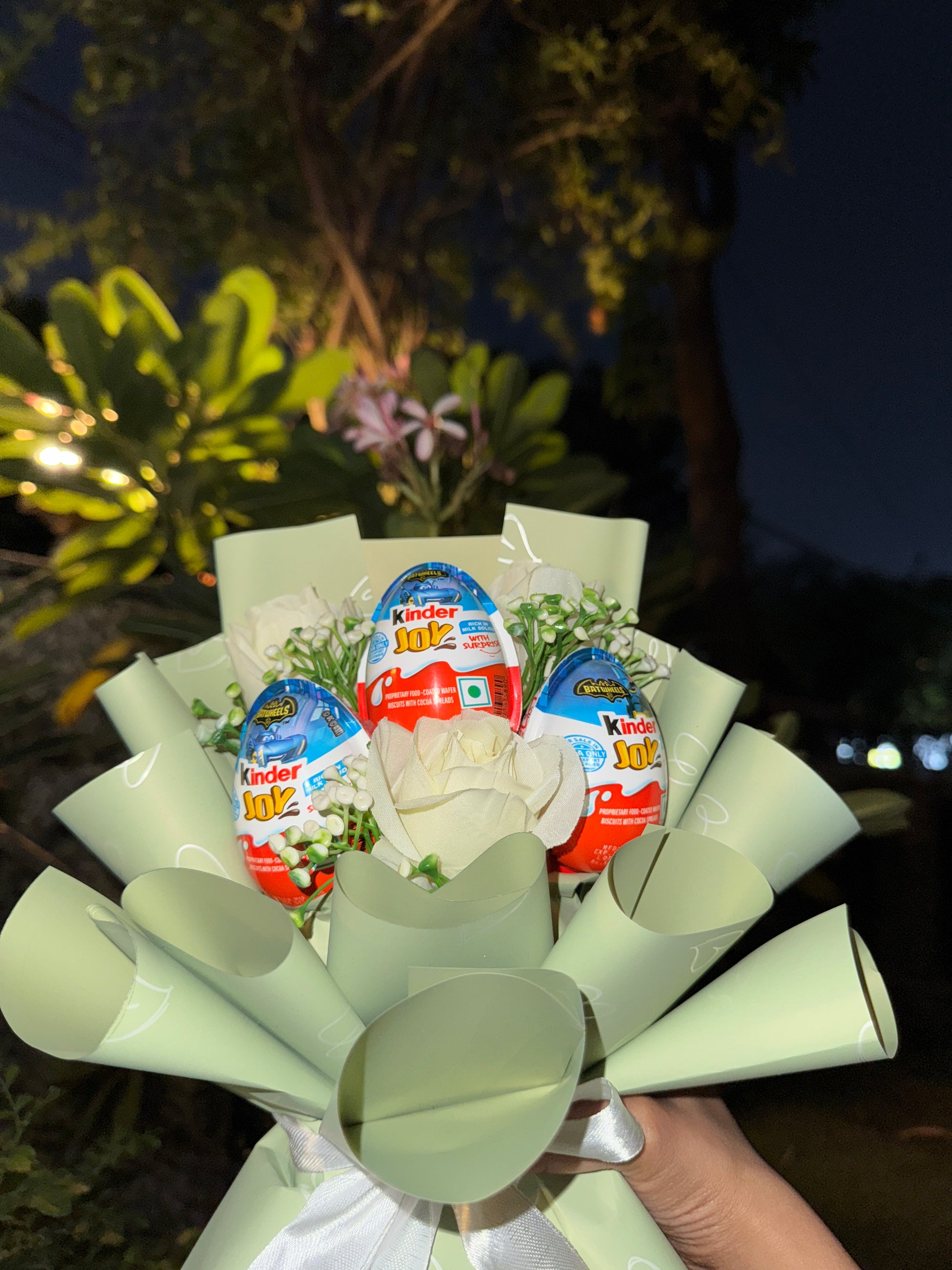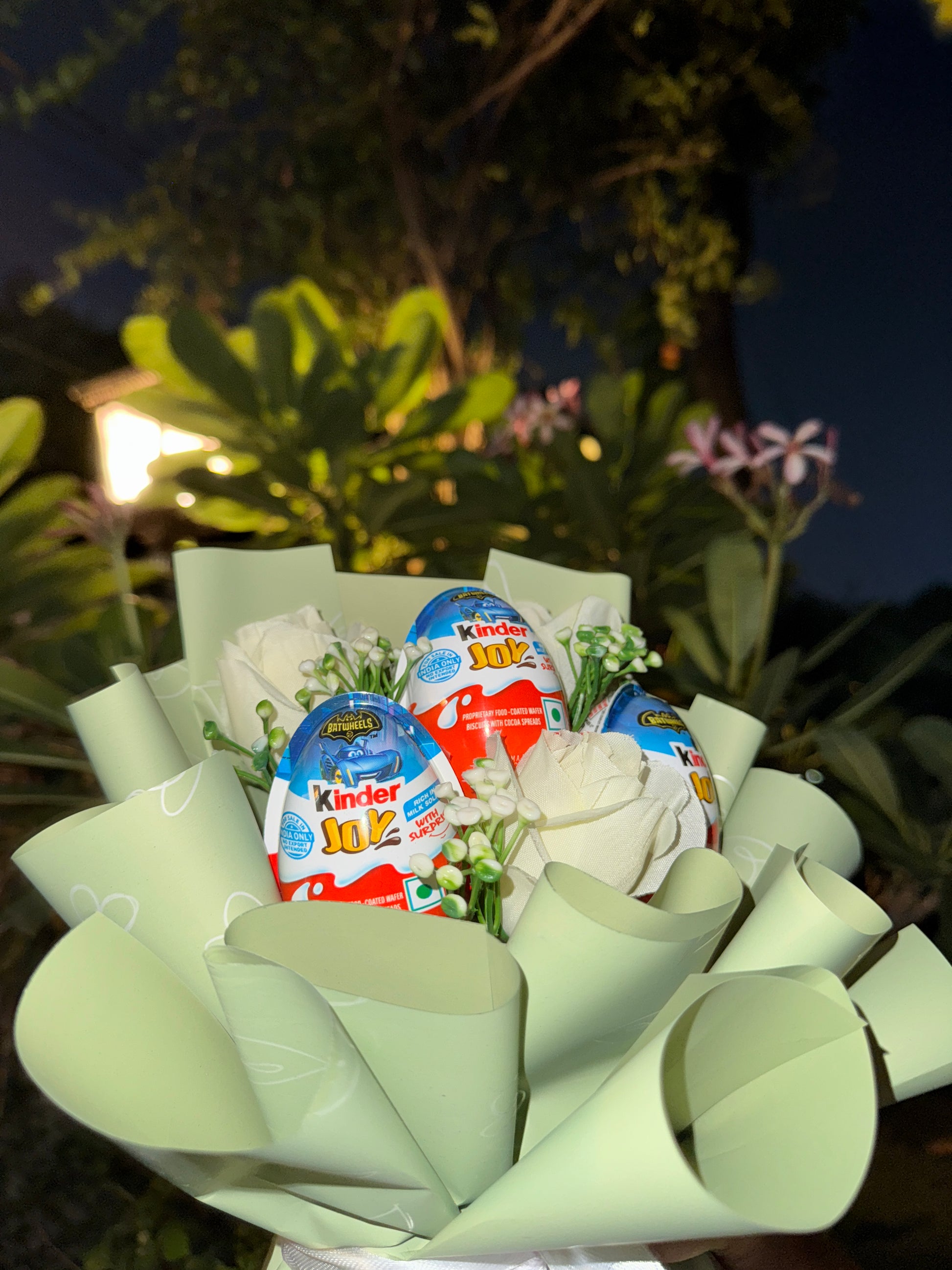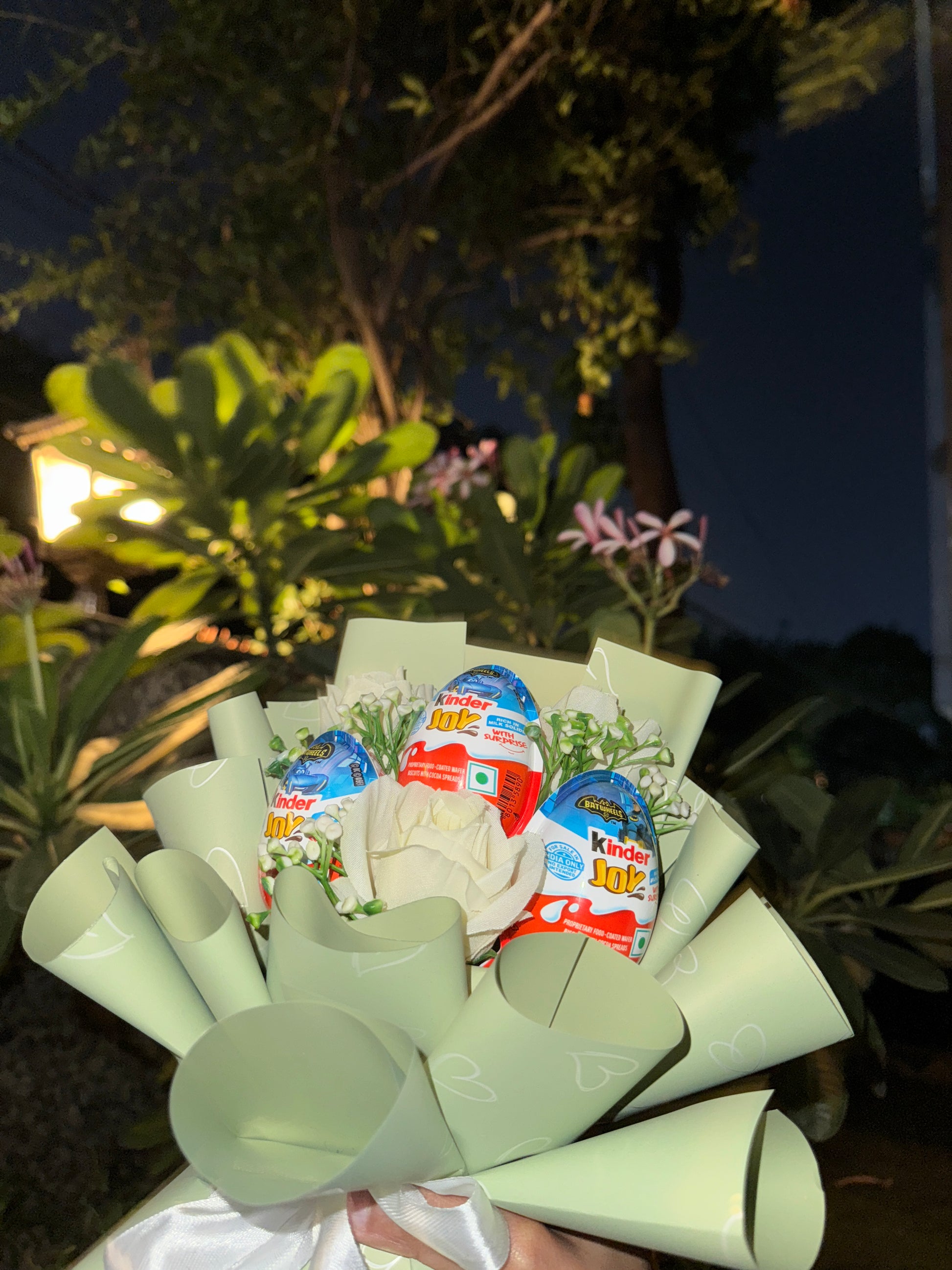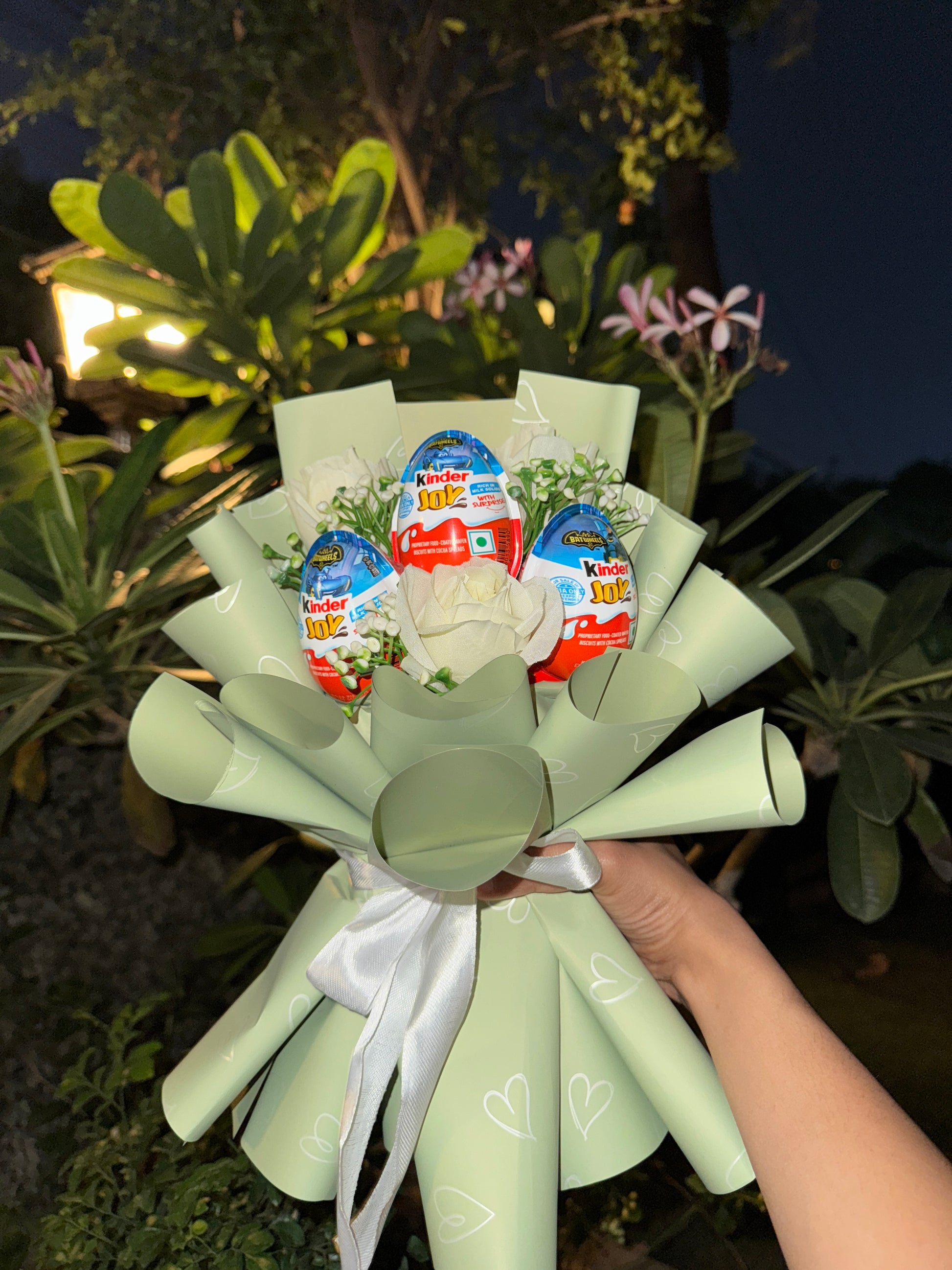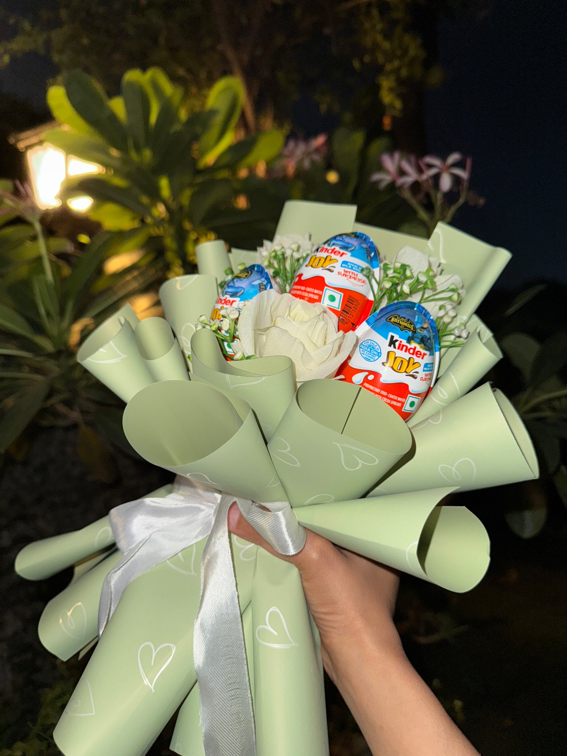 Make celebrations extra special with this Batman Batwheels Kinder Joy Bouquet, a delightful combo of charm and flavor. Featuring 3 Batman Edition Kinder Joy eggs and beautifully arranged white artificial flowers, this bouquet is wrapped in elegant mint green paper with cute heart patterns – a perfect blend of playfulness and elegance.