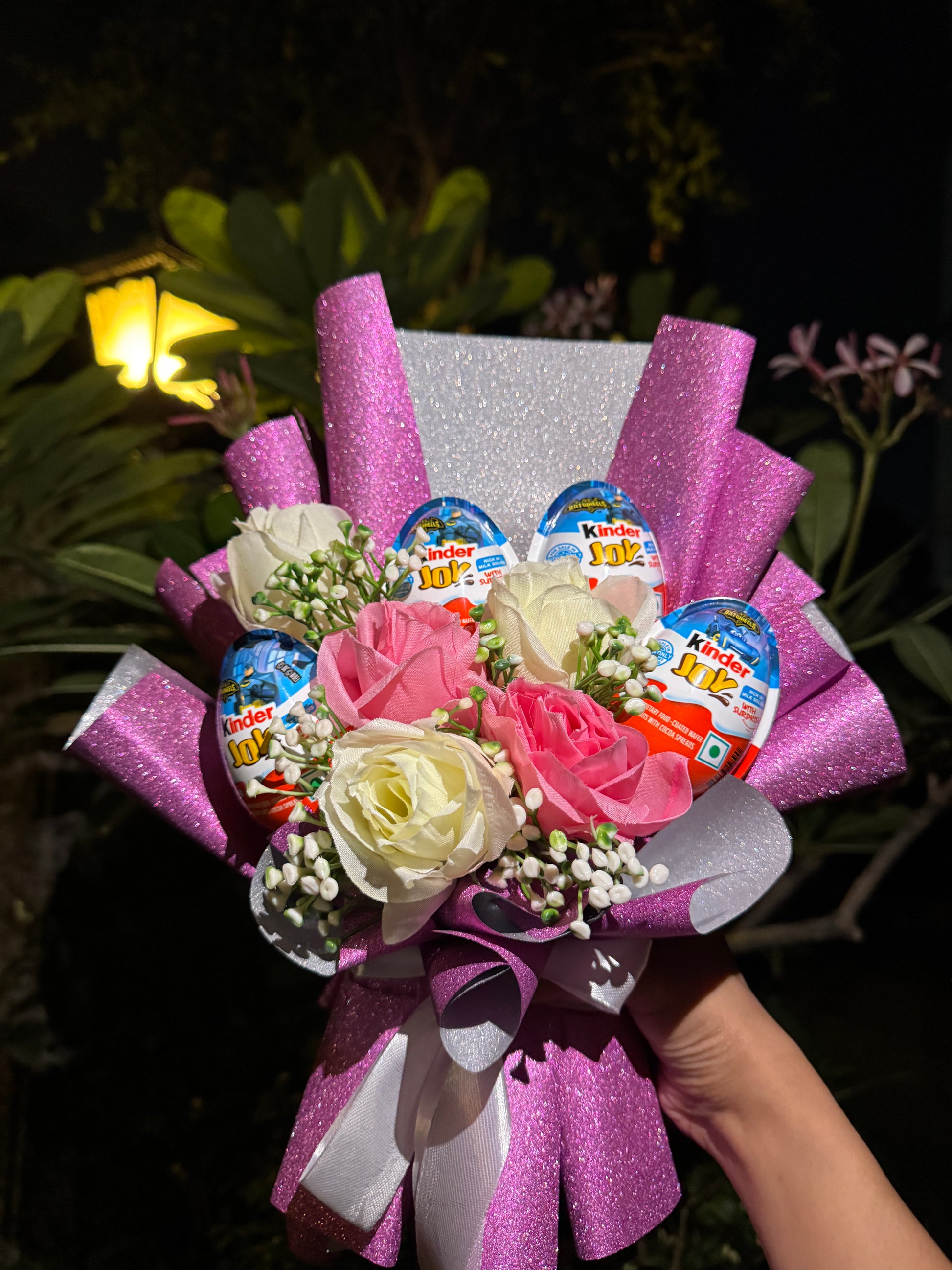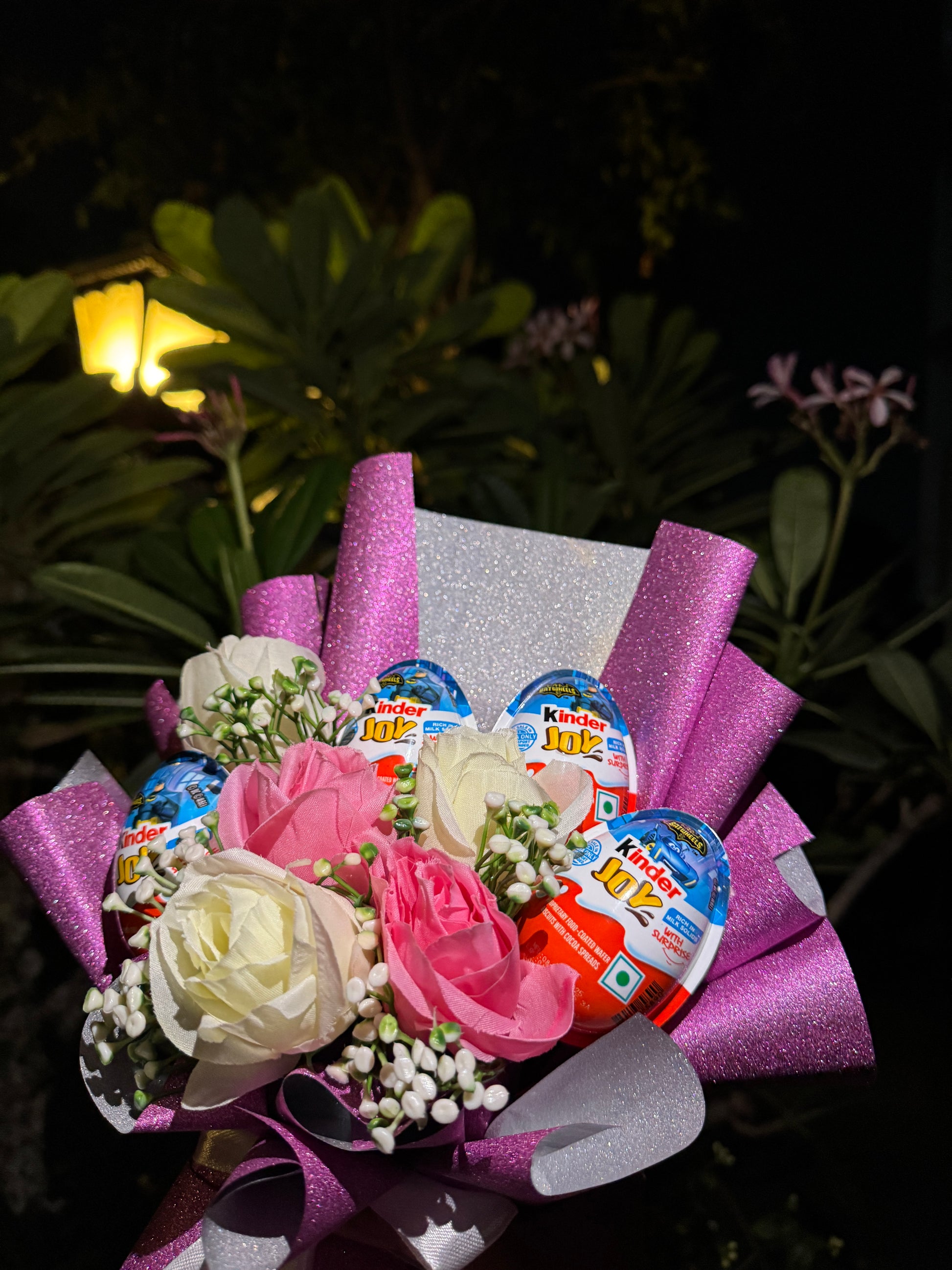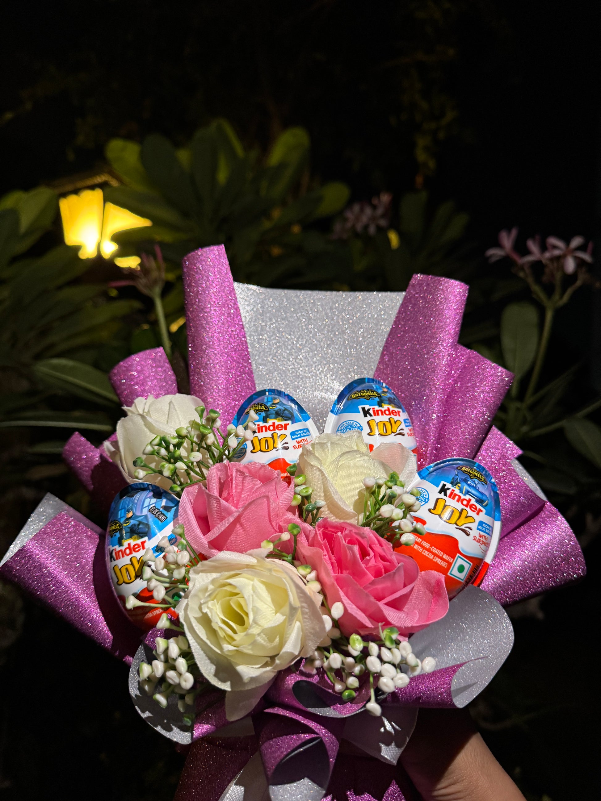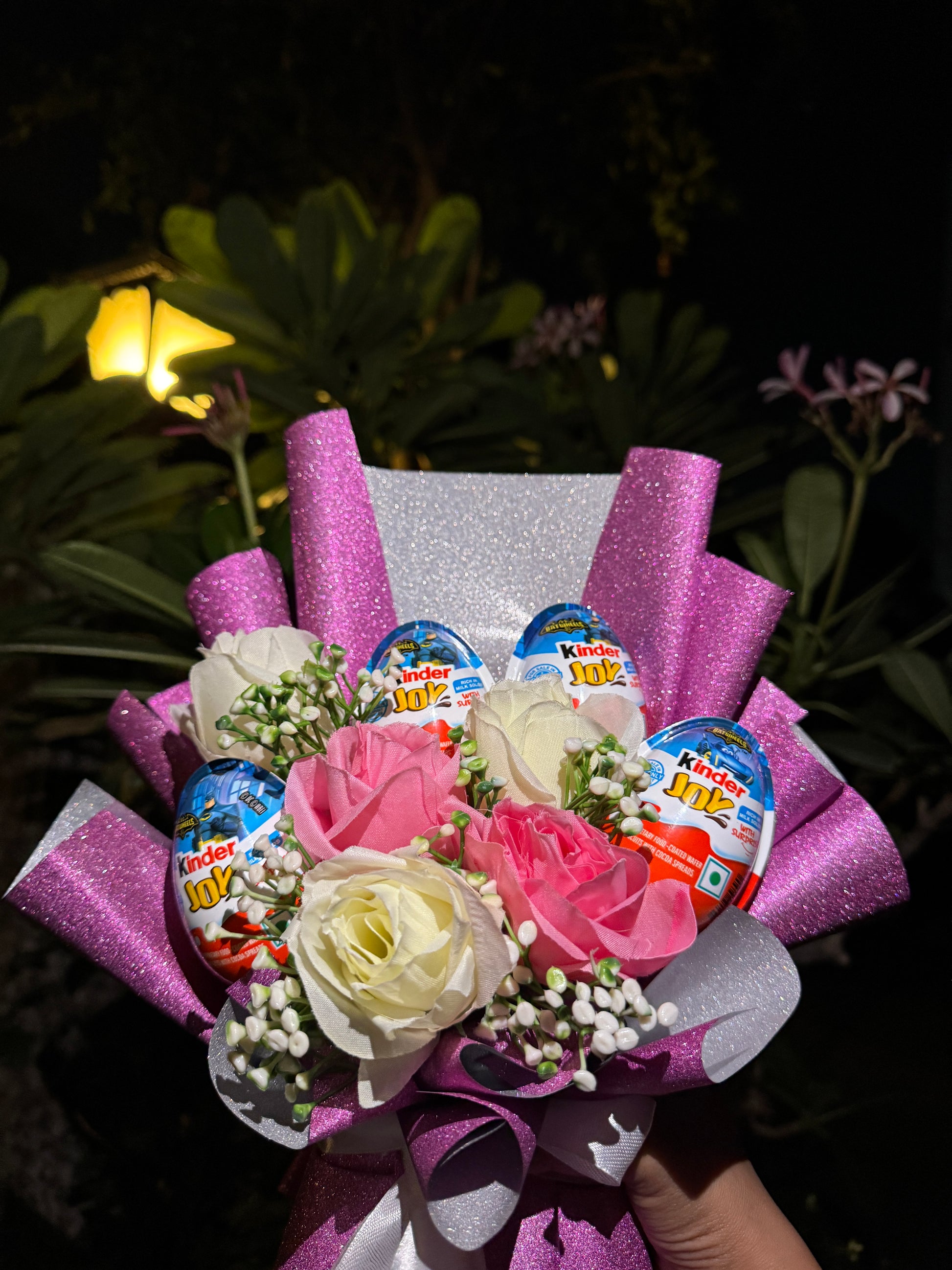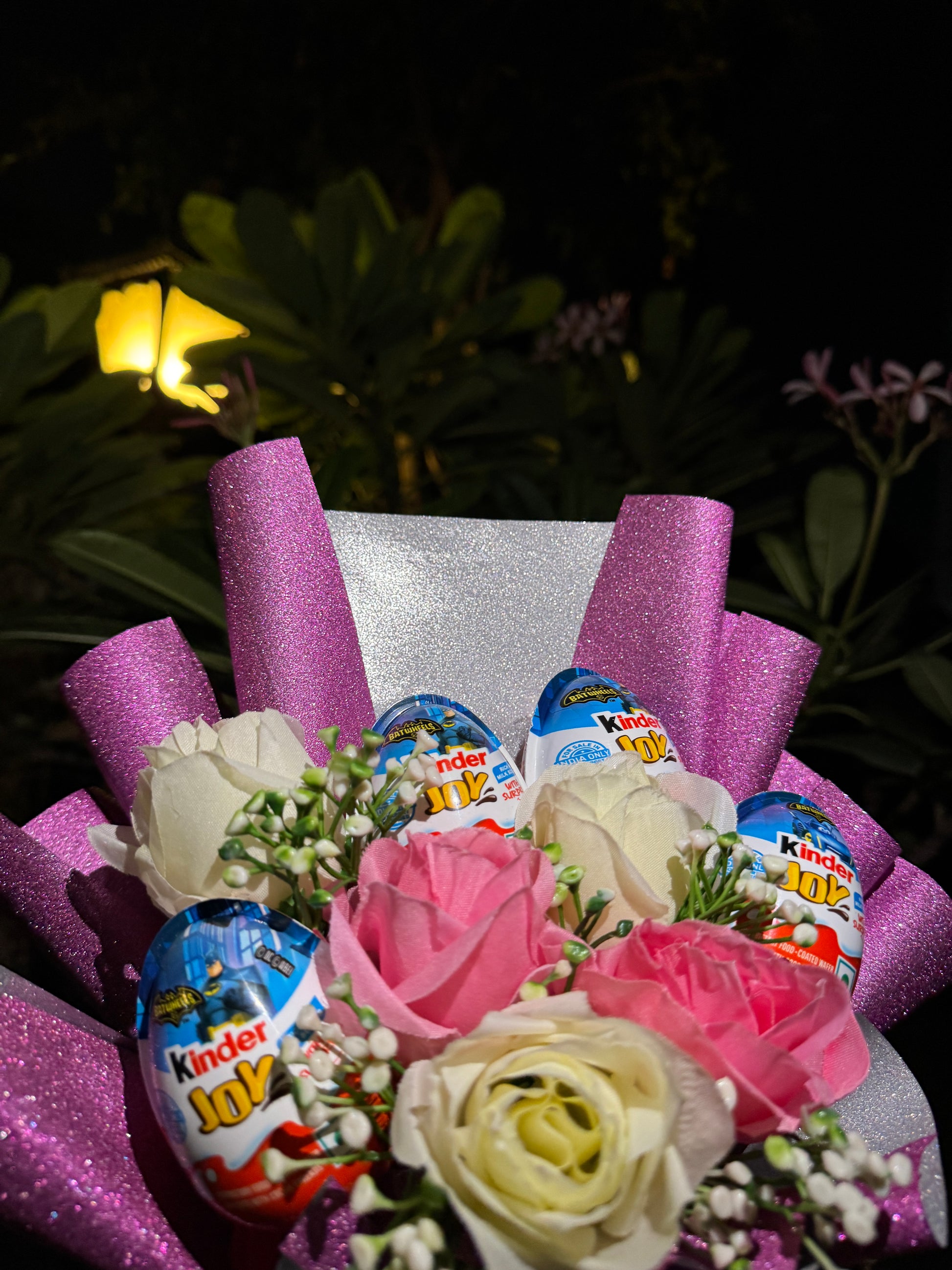 Brighten someone’s day with our Kinder Joy Glitter Bouquet, a stunning blend of charm, sweetness, and sparkle. This eye-catching bouquet features 4 Batman Edition Kinder Joy eggs nestled among soft pink and ivory artificial roses, with delicate fillers that add to its elegance. Wrapped in shimmering glittery pink and silver paper, it’s a gift that’s as delightful to see as it is to receive.
