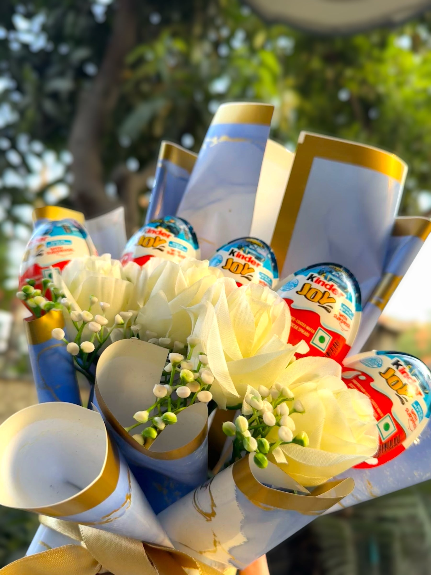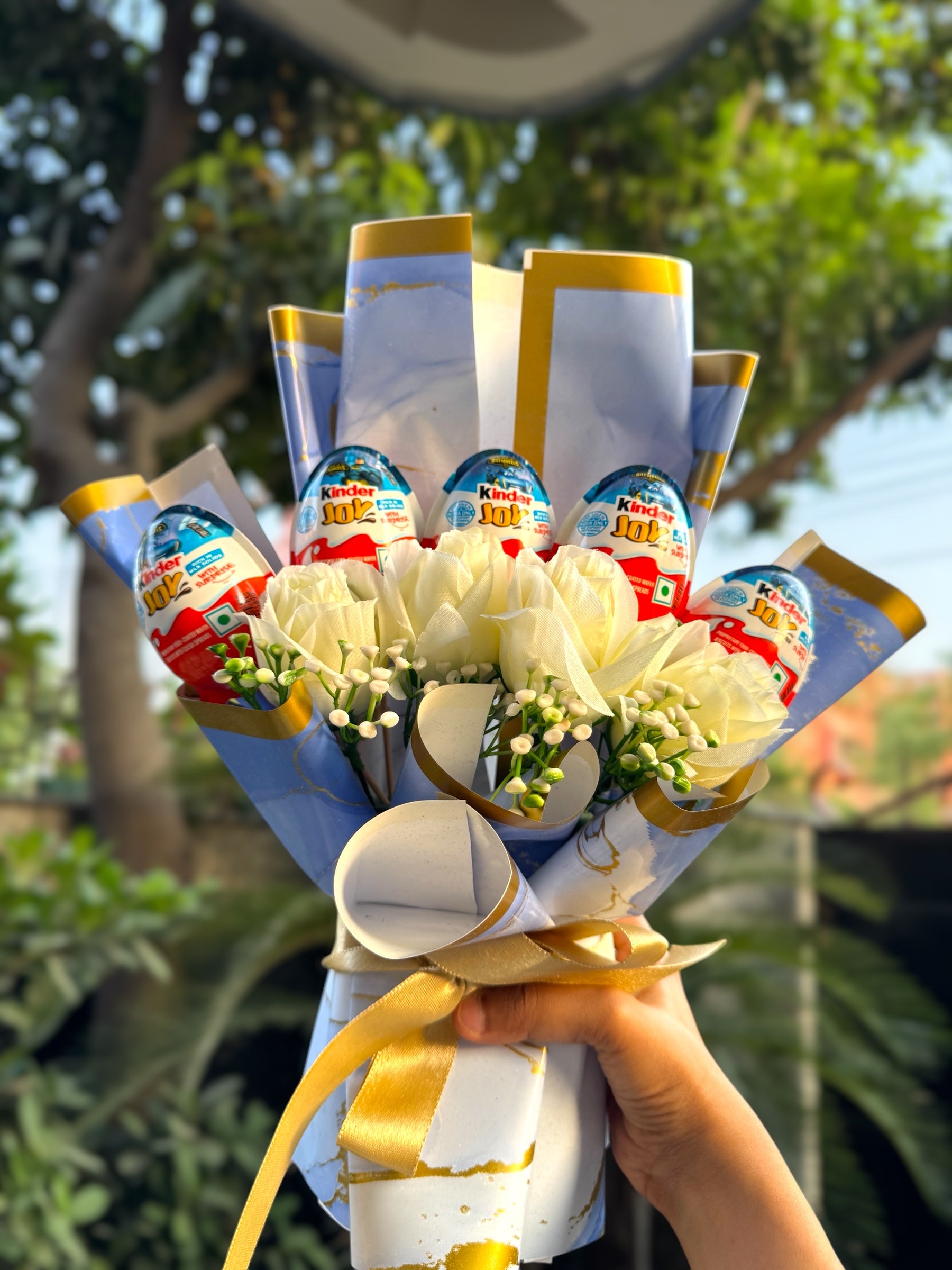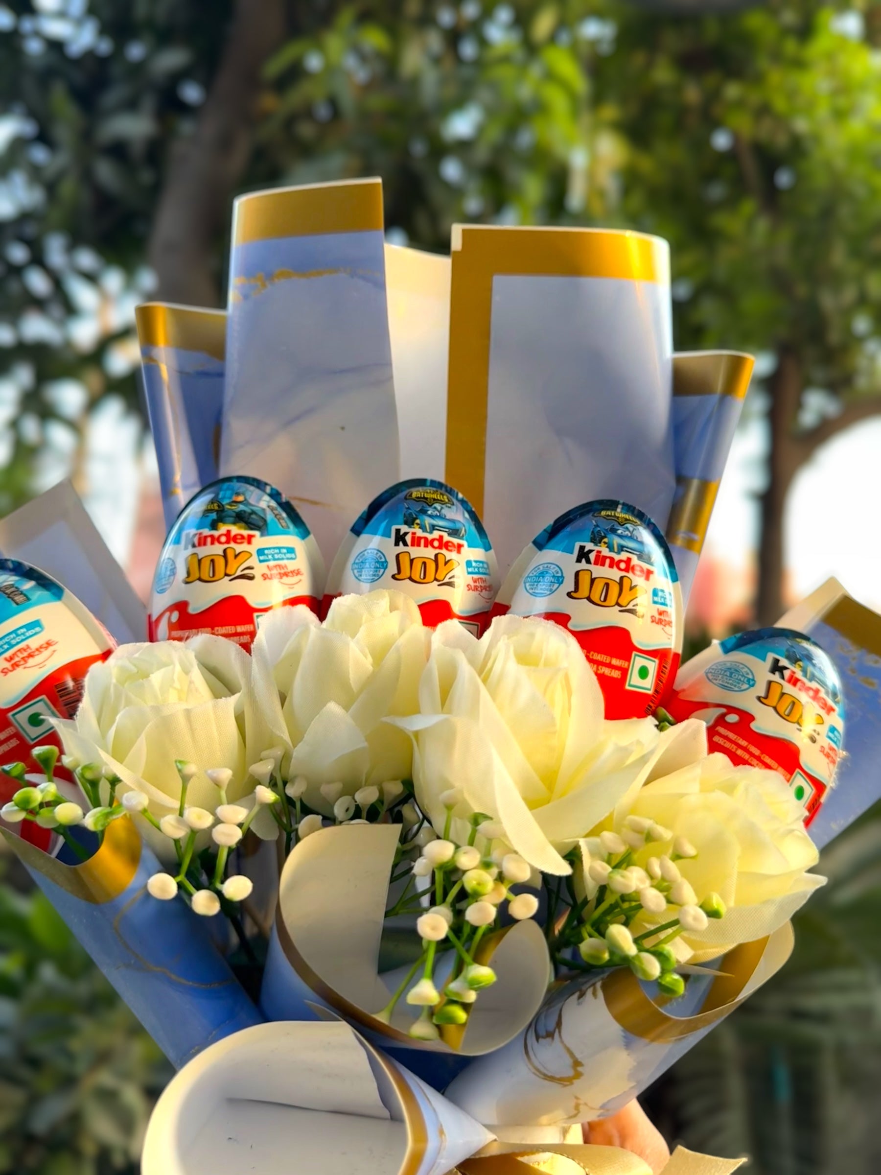 Make celebrations extra special with this Batman Batwheels Kinder Joy Bouquet, a delightful combo of charm and flavor. Featuring 5 Batman Edition Kinder Joy eggs and beautifully arranged white artificial flowers, this bouquet is wrapped in elegant mint green paper with cute heart patterns – a perfect blend of playfulness and elegance.