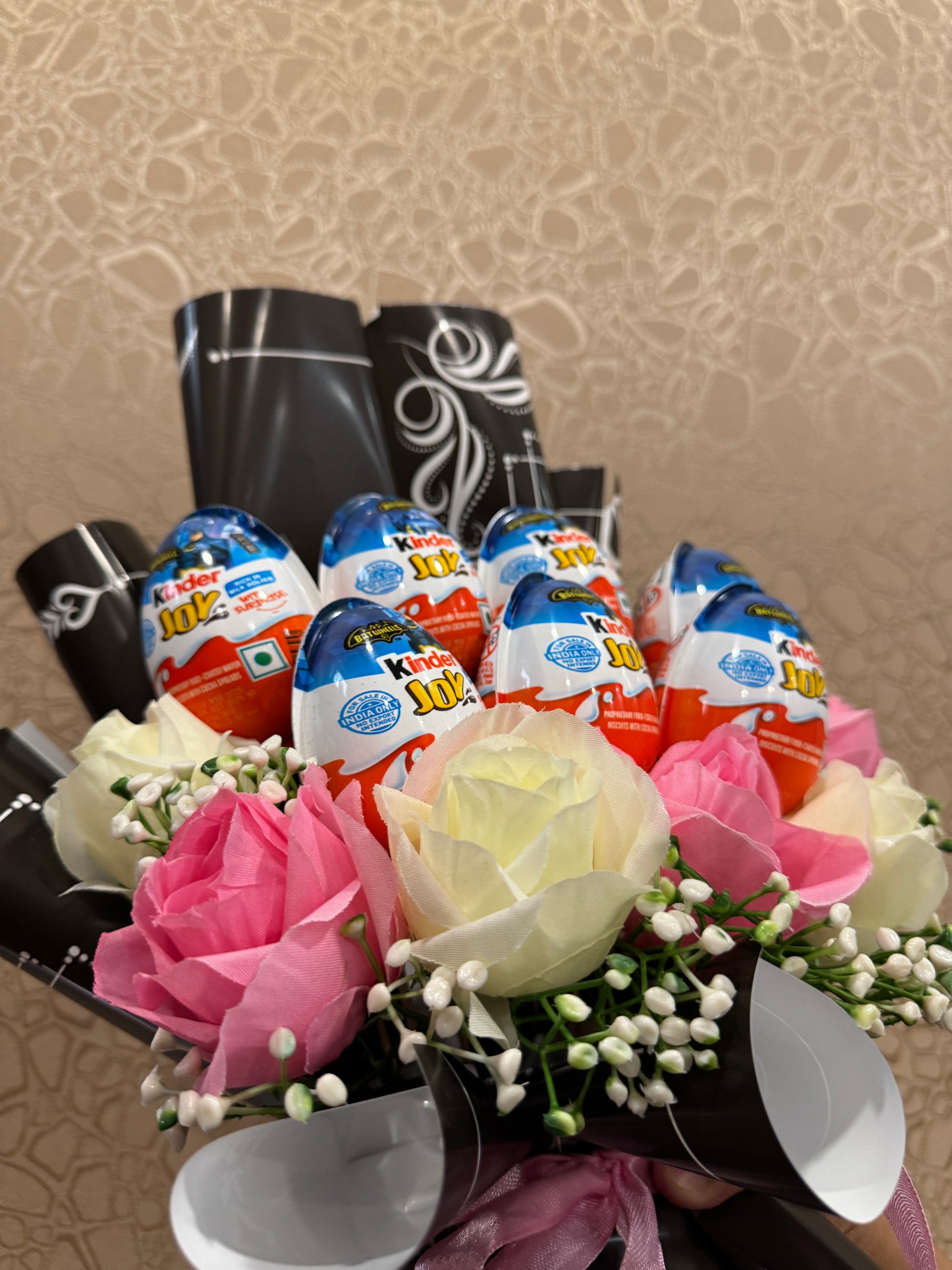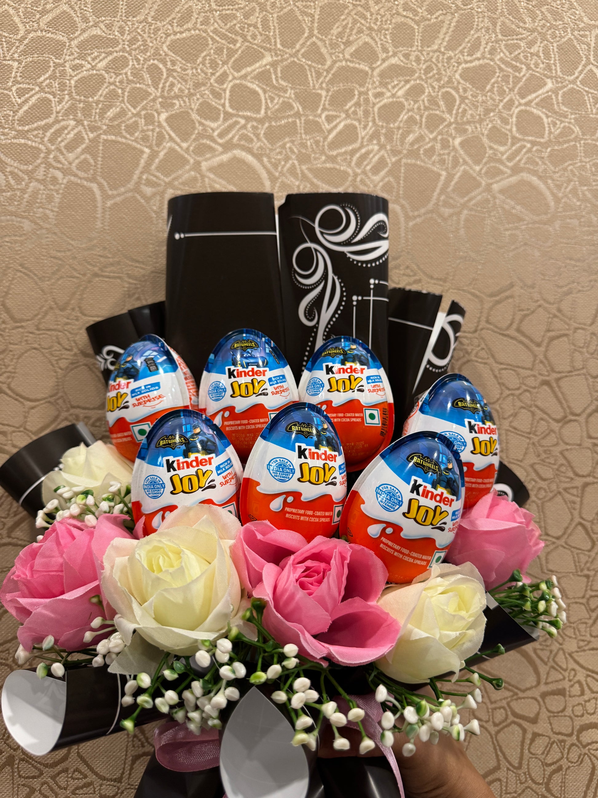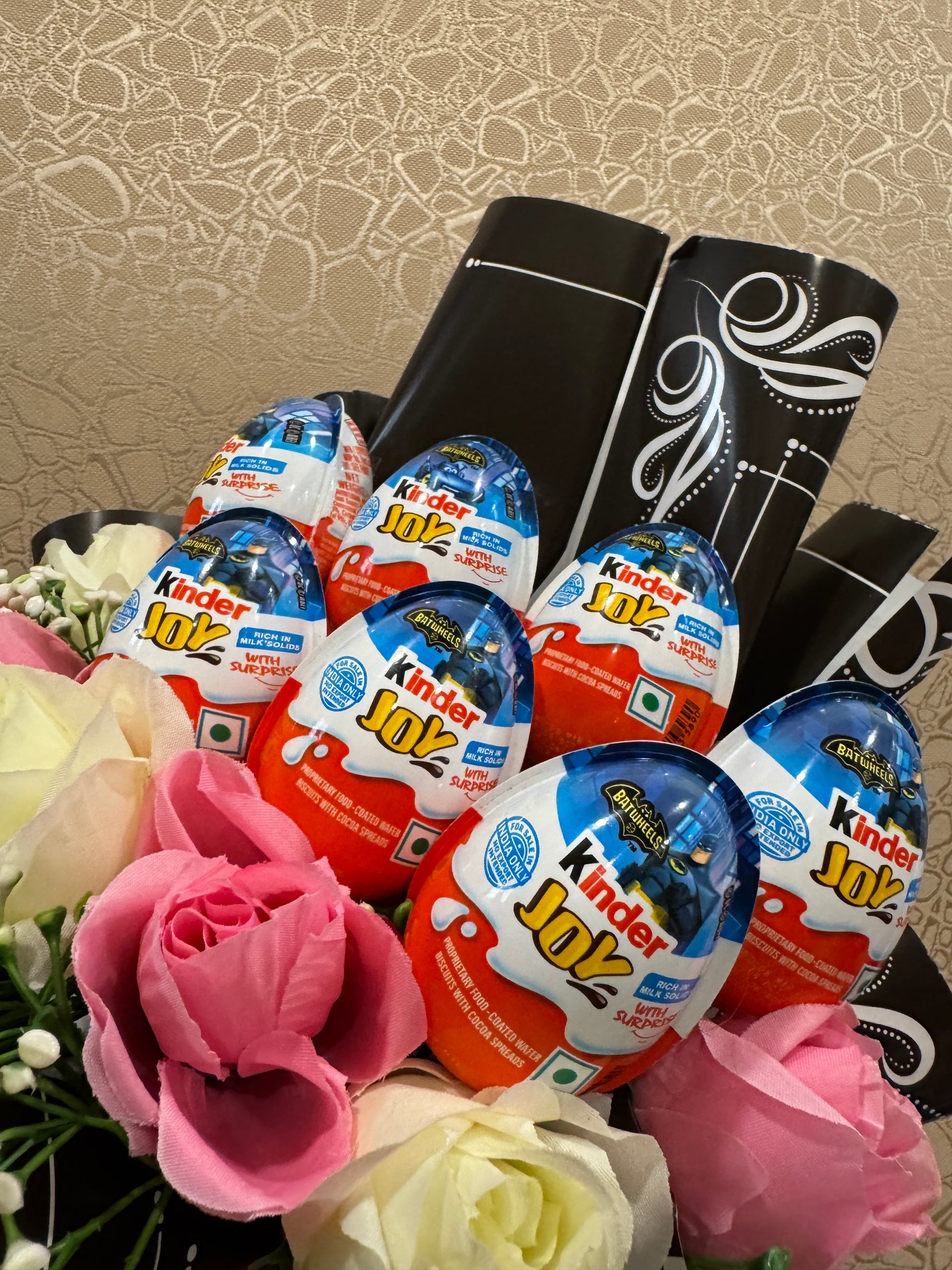 Unleash the thrill of adventure with our Batwheels Kinder Joy Bouquet, a perfect fusion of fun and flair. This eye-catching arrangement features seven Batwheels Kinder Joy toys, beautifully wrapped in a striking black sheet for a dramatic touch. Complemented by a soft blend of pink and white flowers, this bouquet brings together action and elegance in one unforgettable gift.