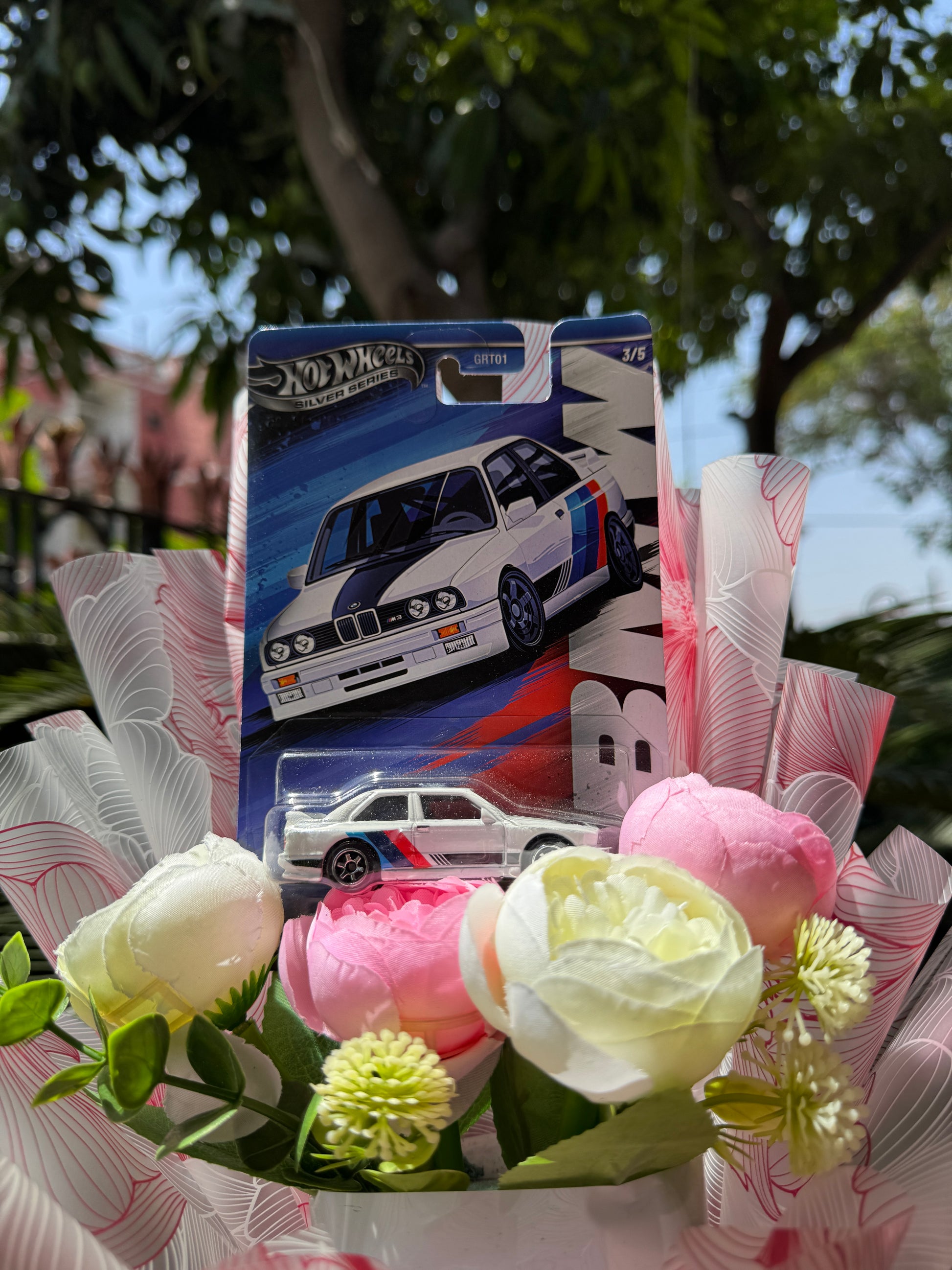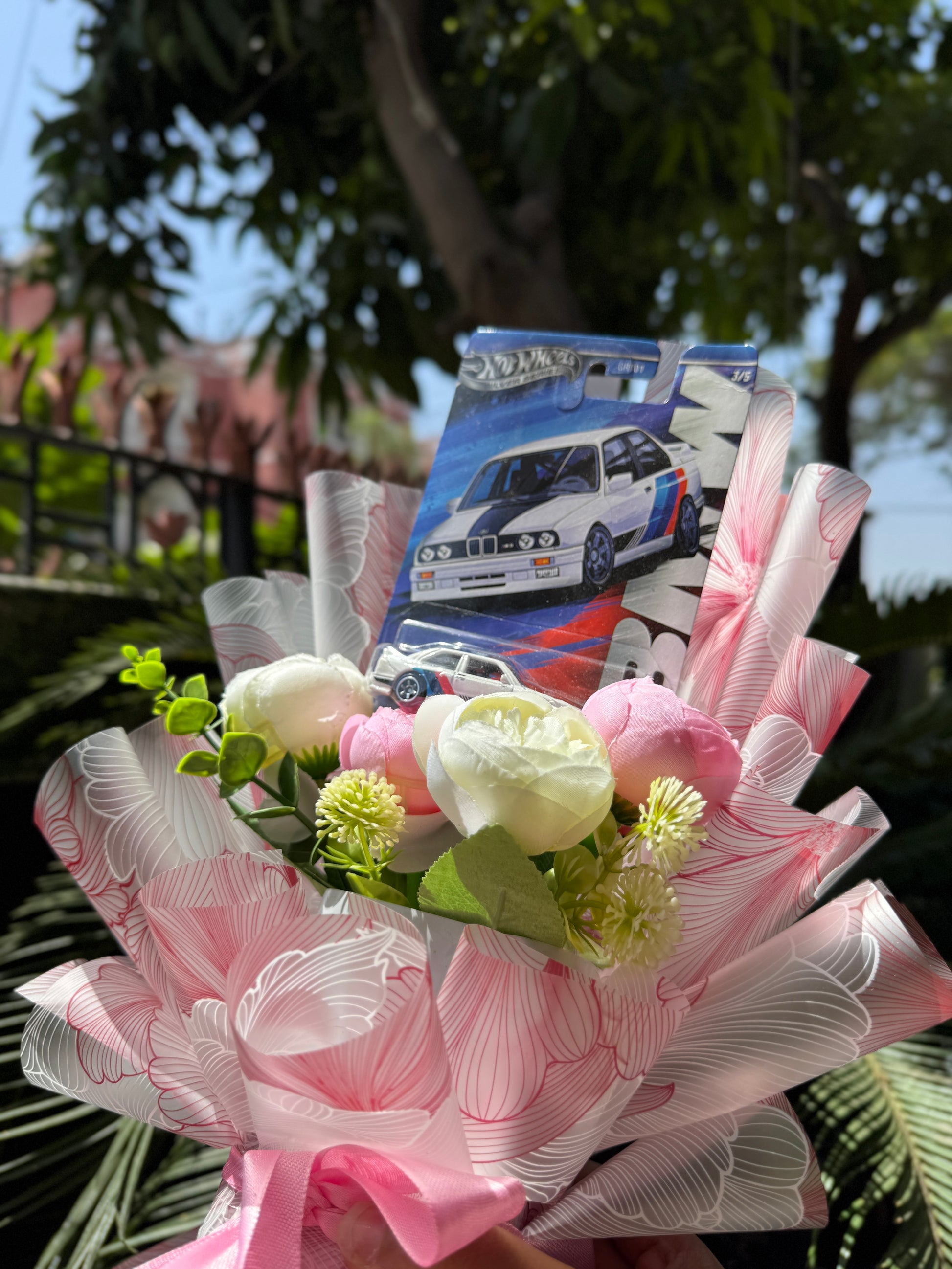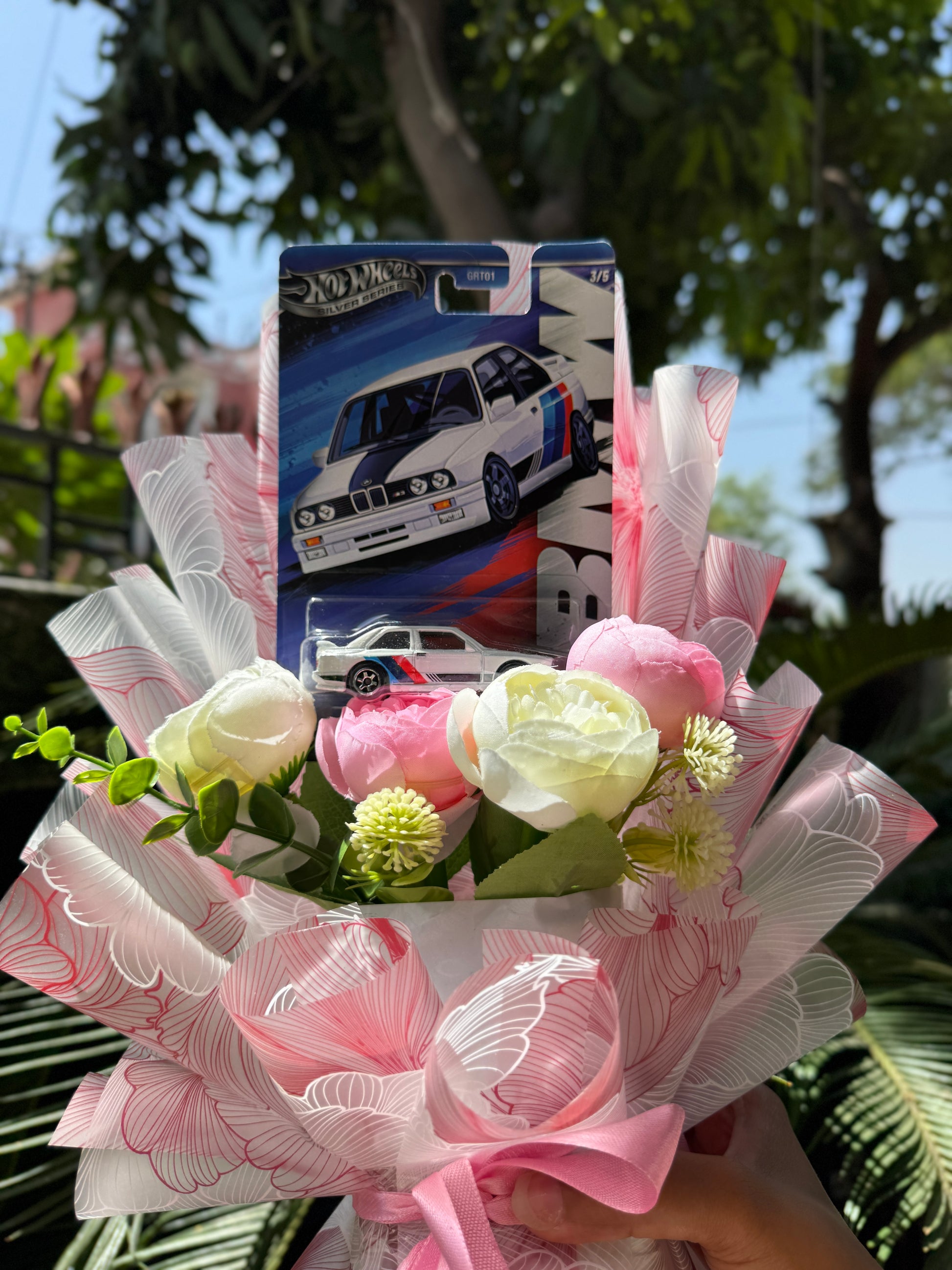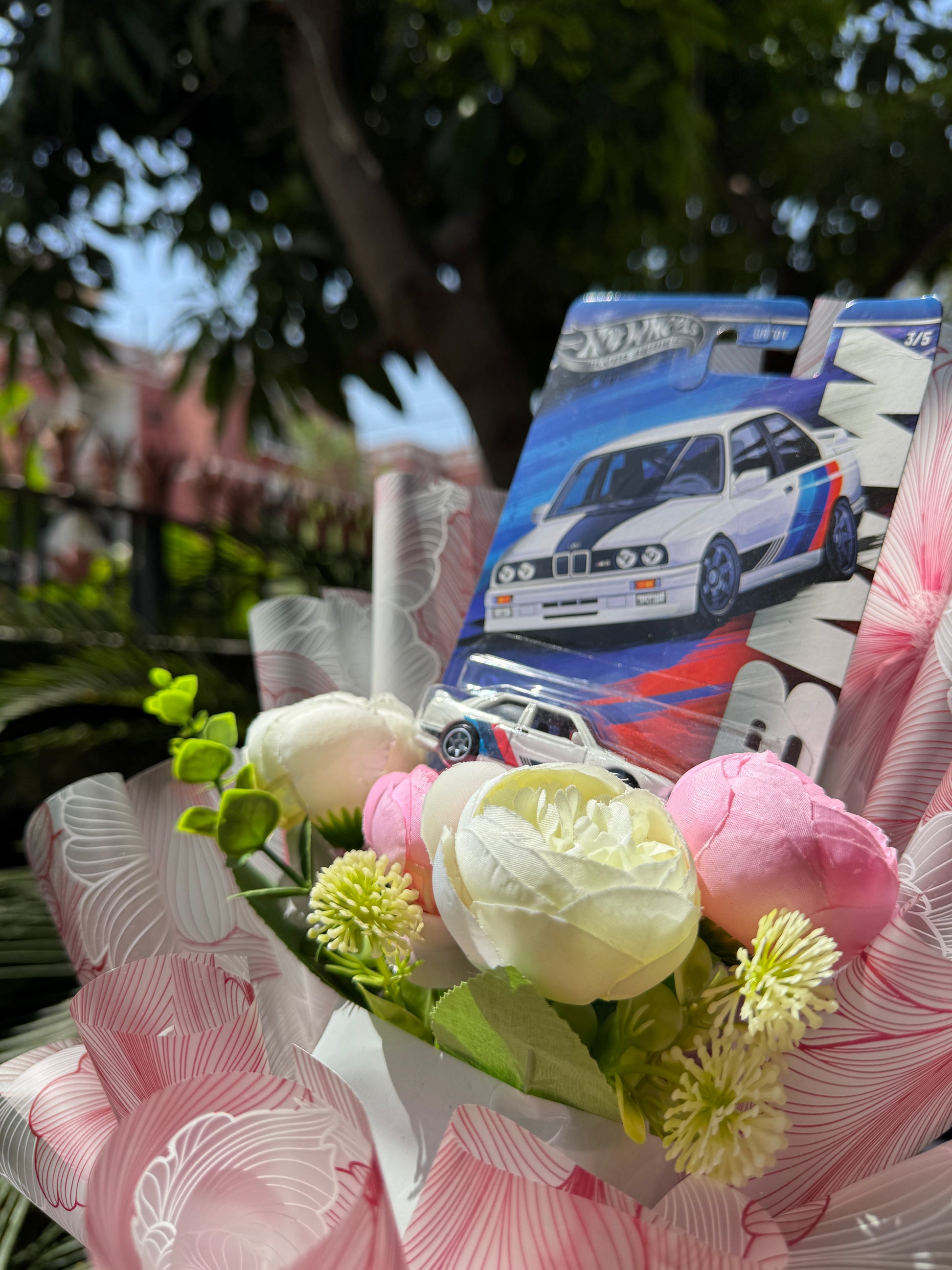 Elegance, heritage, and horsepower — all wrapped in one beautiful gesture. Introducing the BMW M3 Hot Wheels Bouquet, crafted for those who love iconic cars and charming aesthetics. Featuring the legendary BMW M3 in diecast form, surrounded by soft pink and white florals, this bouquet blends the nostalgia of motorsport with delicate, romantic charm.