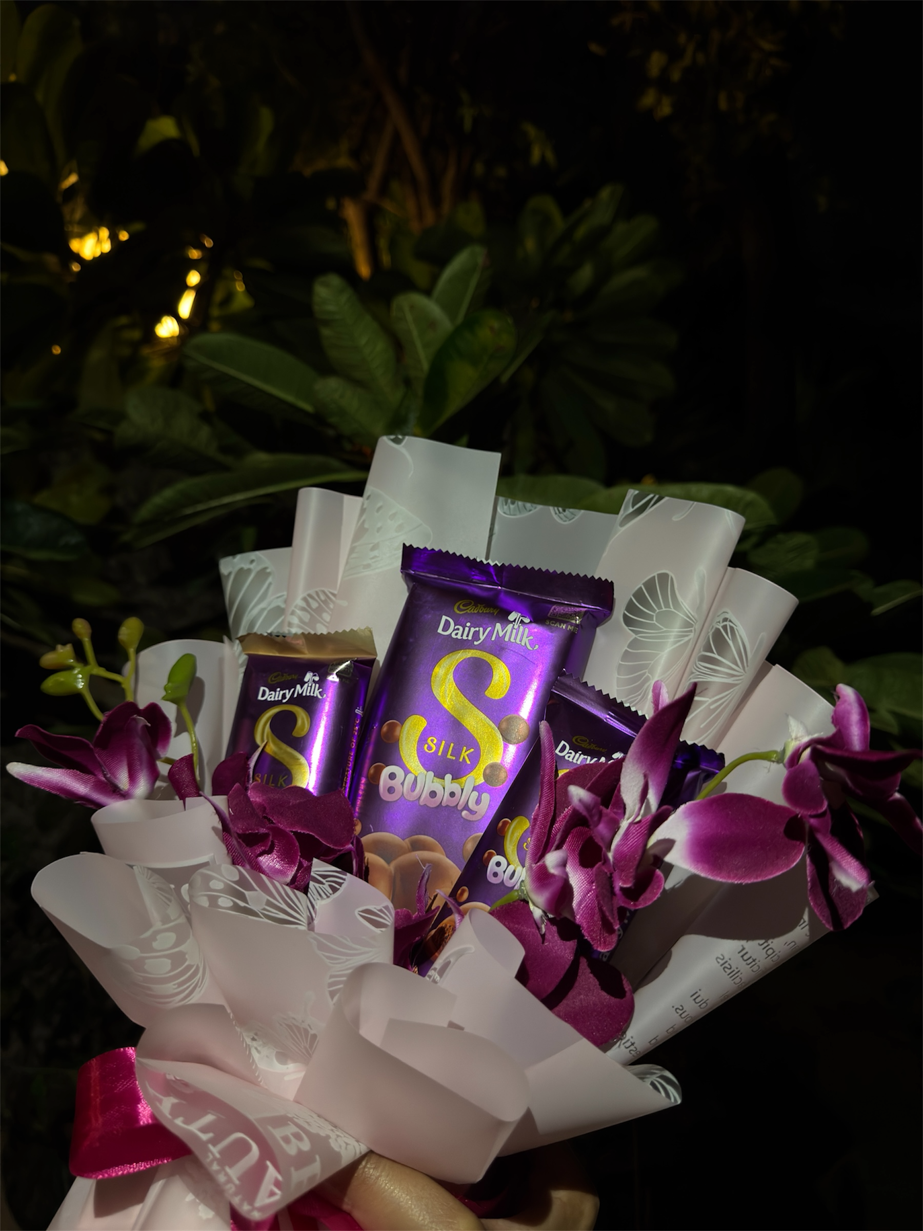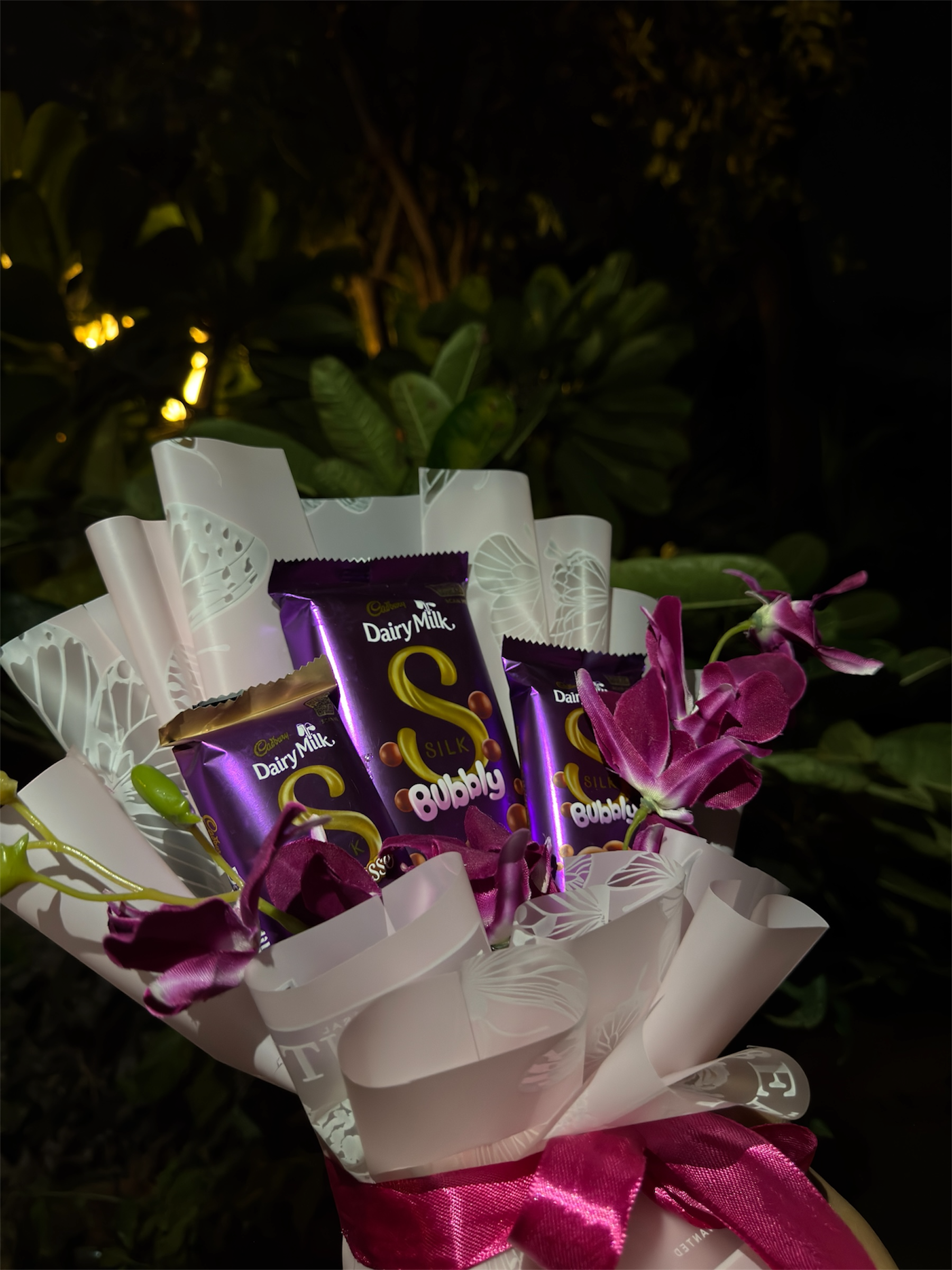 Gift sweetness wrapped in beauty with this Dairy Milk Silk & Orchid bouquet, designed to melt hearts with every detail. Featuring 3 rich and creamy Dairy Milk Silk chocolates, paired with elegant pink artificial orchids, and wrapped in a soft light pink sheet, this bouquet is the definition of grace, love, and indulgence.