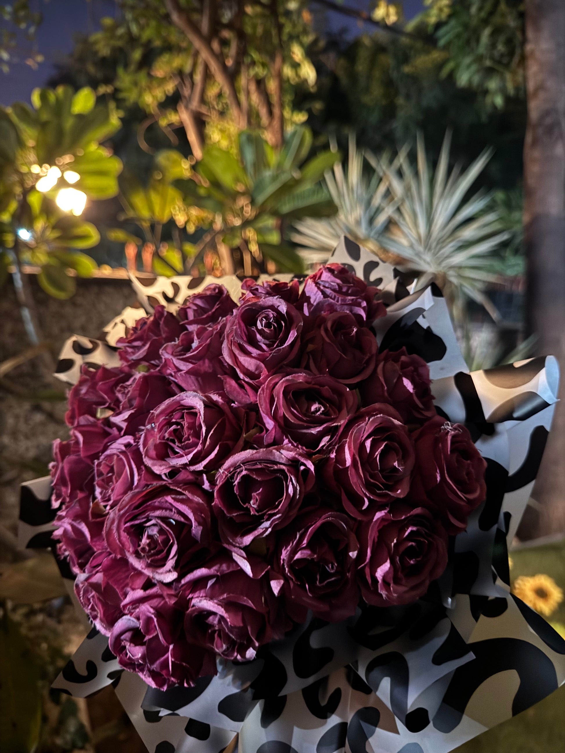 This is not a regular flower bouquet—it’s a statement floral piece. The unique purple shade paired with a bold designer wrap makes it ideal for those who prefer something classy, stylish, and different from traditional red or white bouquets.