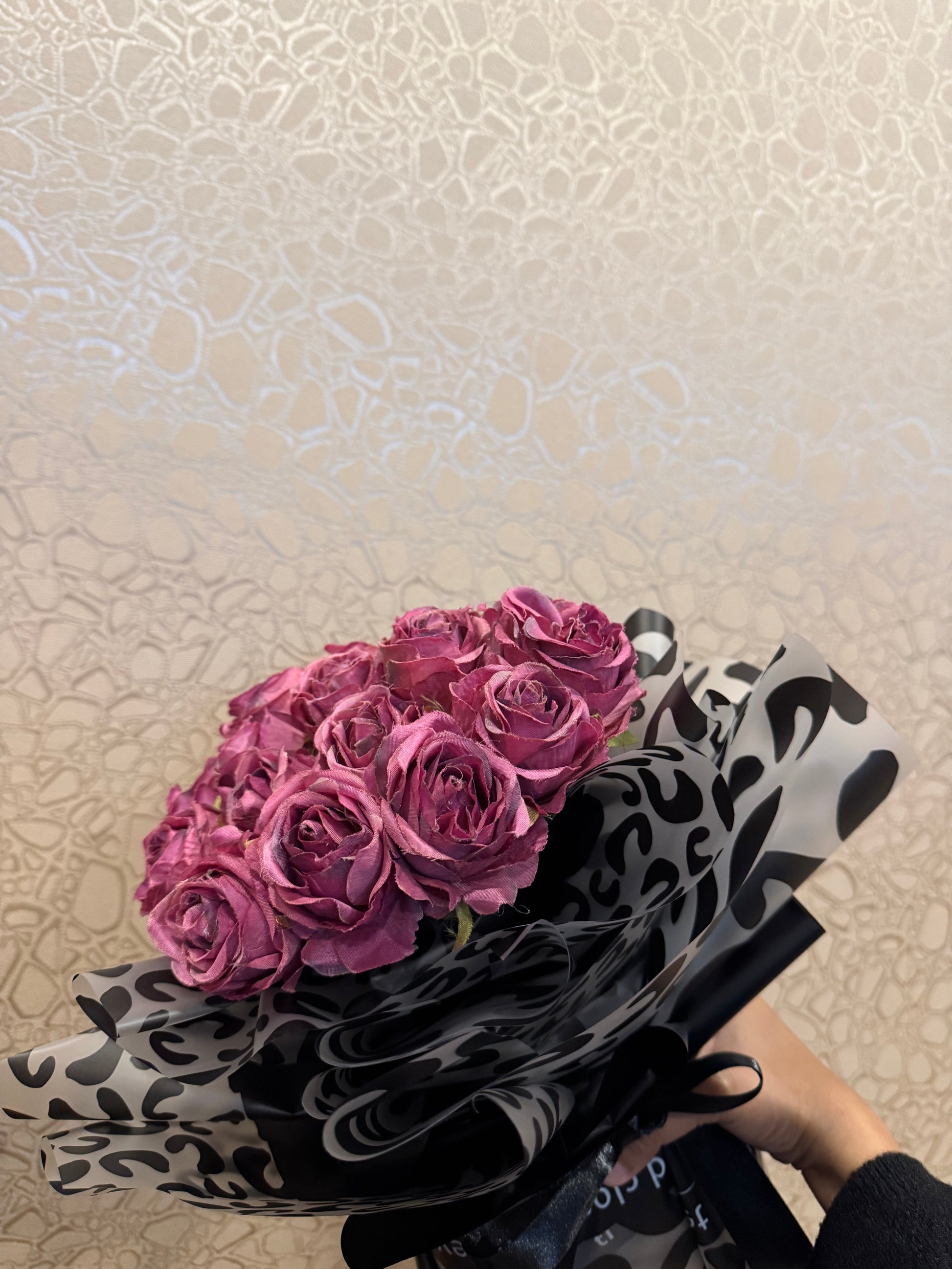 Make a graceful and unforgettable impression with this beautifully handcrafted Purple Rose Bouquet, designed for those who appreciate elegance, depth, and timeless beauty. Featuring rich purple roses wrapped in a striking black-and-white designer wrap, this bouquet is perfect for sophisticated gifting and décor.