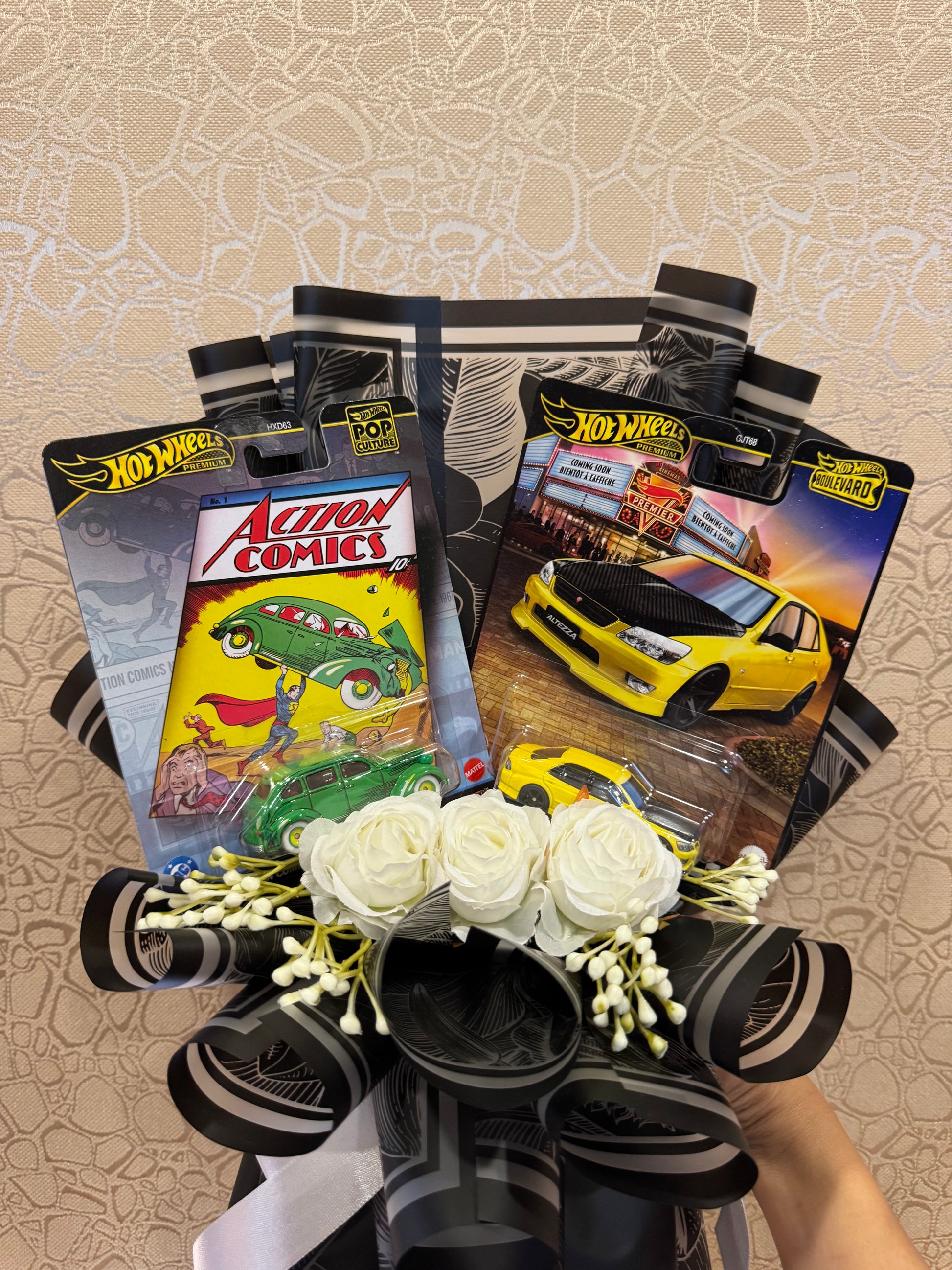 The Hot Wheels Action Comics #1 – Action Sedan/Berline & 1998 Toyota Altezza Bouquet is a premium collectible-style gift created for Hot Wheels enthusiasts, comic-book lovers, and car fans who appreciate unique and memorable gifting. This handcrafted bouquet includes two packaged Hot Wheels cars — the Action Comics #1 – Action Sedan/Berline (from the Hot Wheels Pop Culture series) and the 1998 Toyota Altezza — arranged in a visually striking presentation. The bouquet is styled with white artificial roses and white floral buds, wrapped in matte-black patterned wrapping sheets and complemented with a satin ribbon, giving it a bold, luxury, and collector-friendly finish.