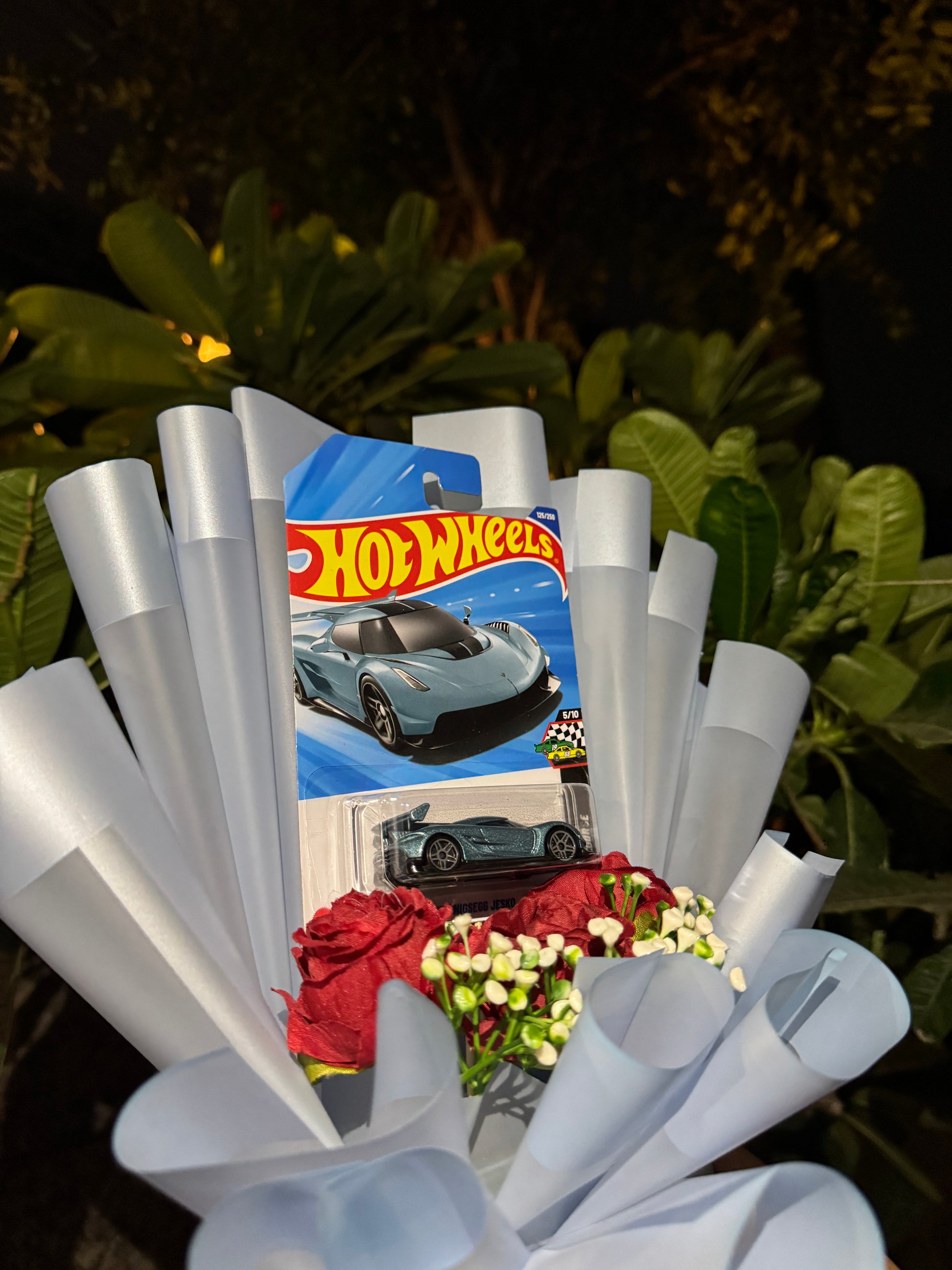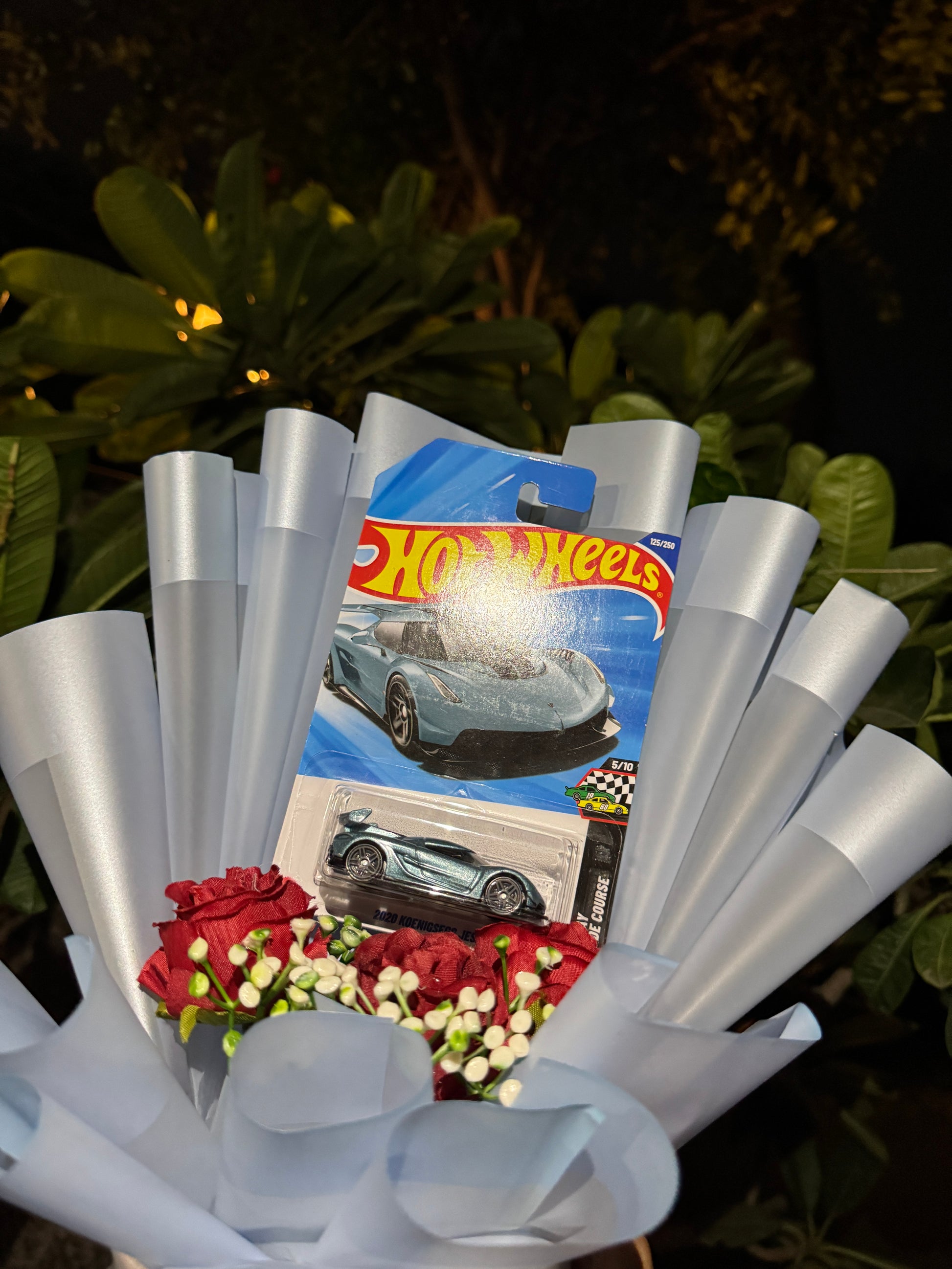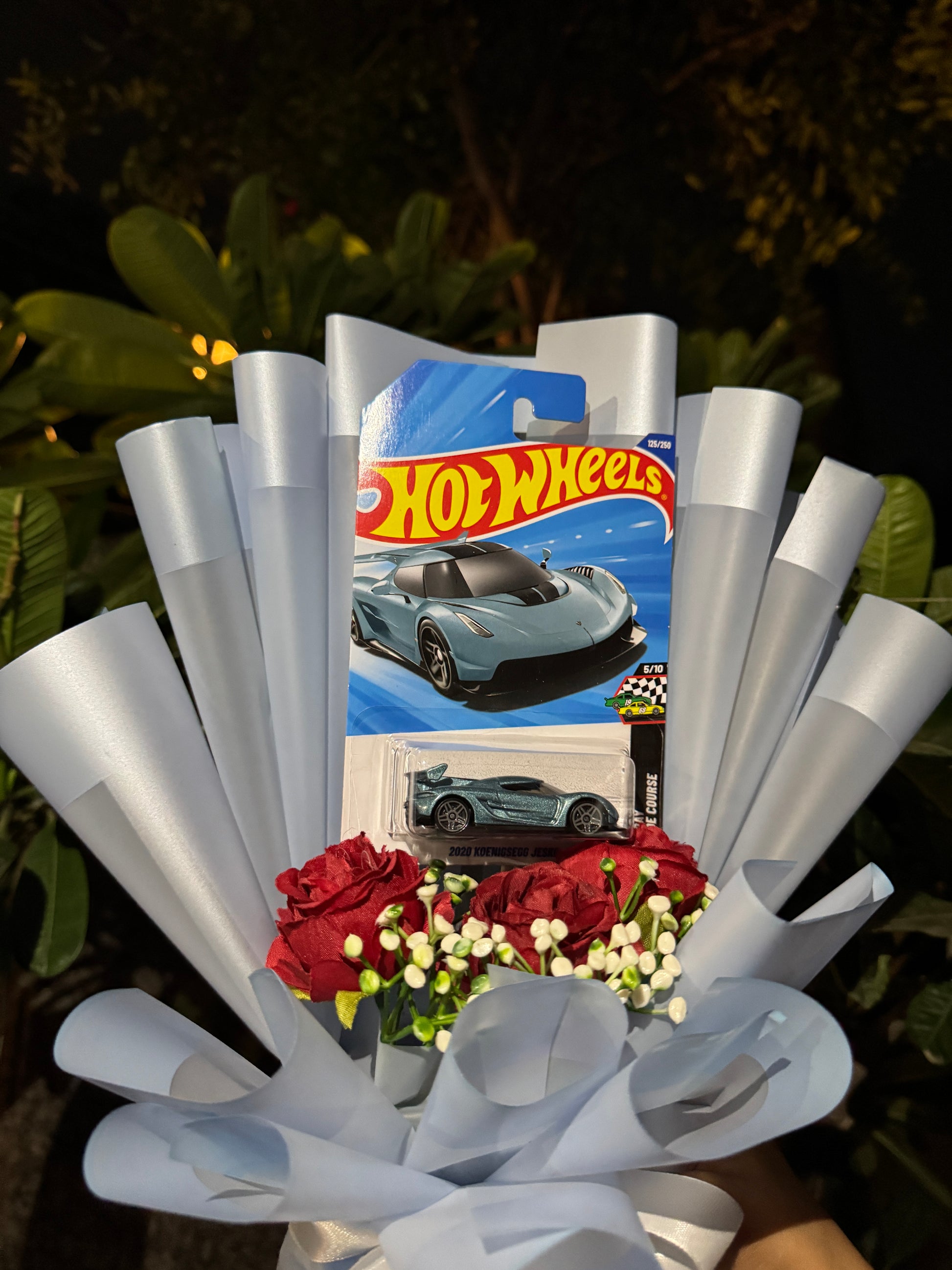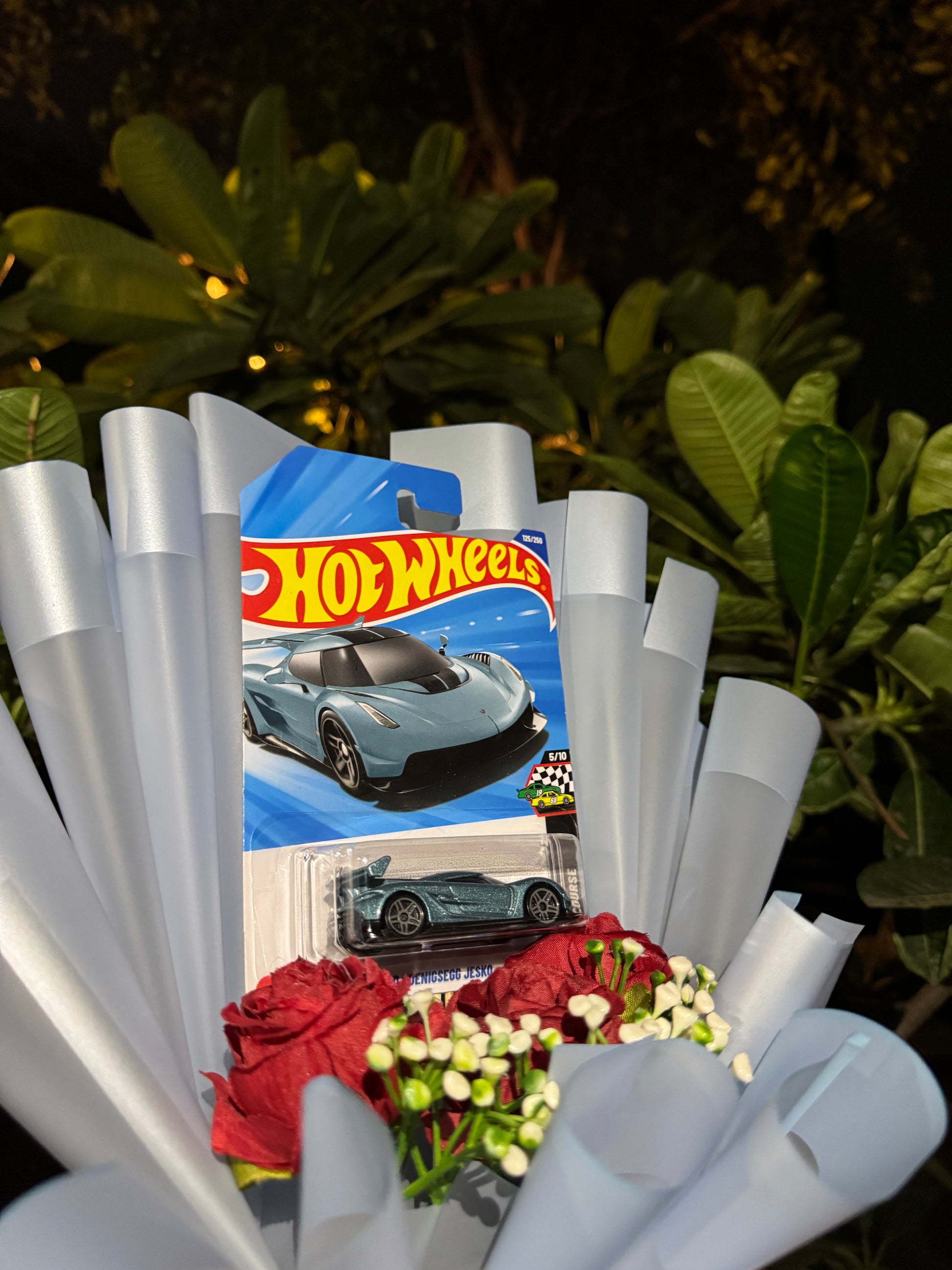 This bouquet is crafted as a unique keepsake, combining the thrill of owning a Hot Wheels Koenigsegg Jesko with the timeless beauty of flowers, creating an unforgettable surprise for car lovers, collectors, and special occasions.