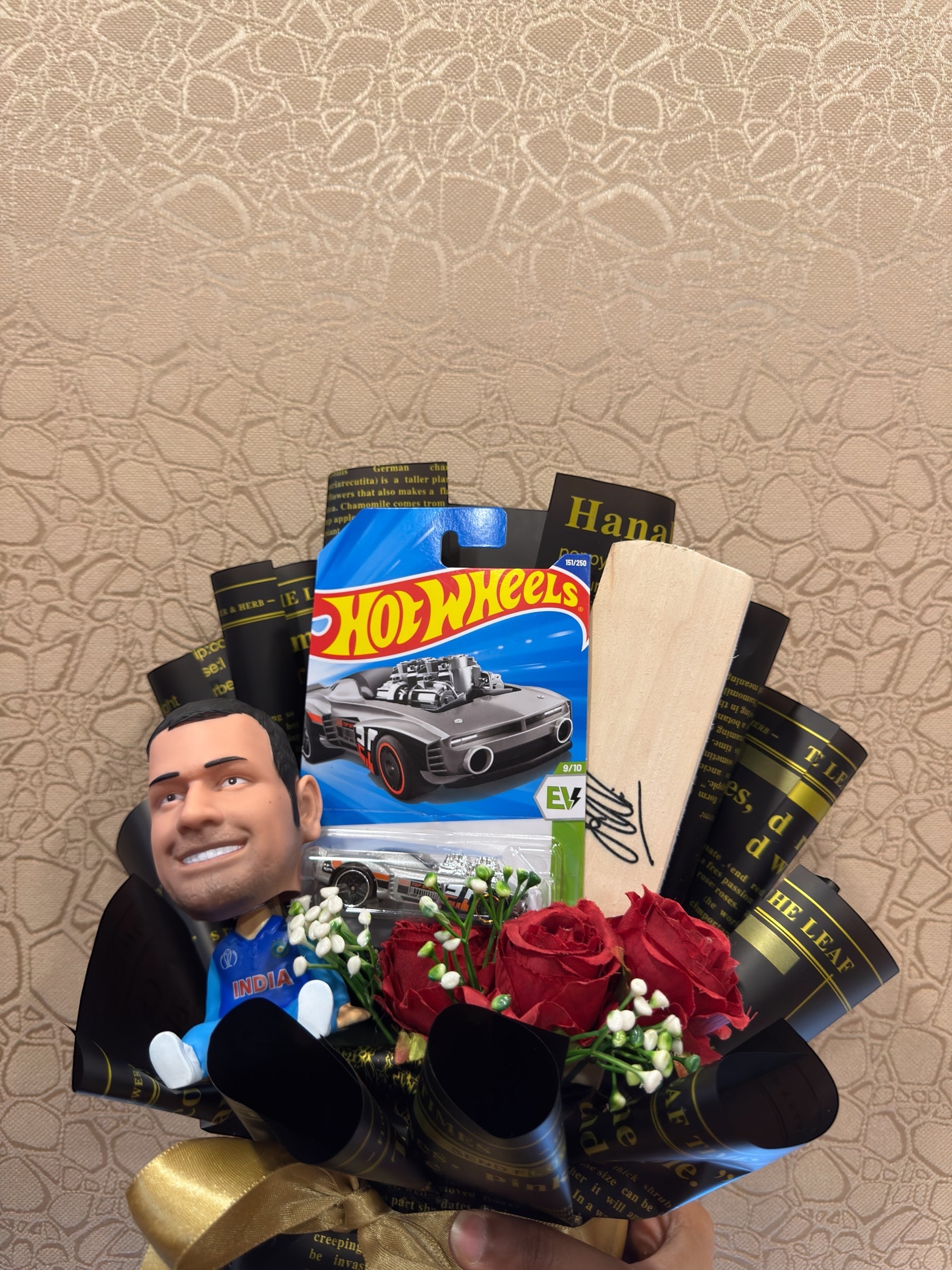 Celebrate cricket fandom with our exclusive MS Dhoni Bouquet, combining collectibles and elegance. Perfect for sports enthusiasts, this bouquet features MS Dhoni’s bubble head, signature bat, and Rodger Dodger 2.0, paired with vibrant red artificial roses.