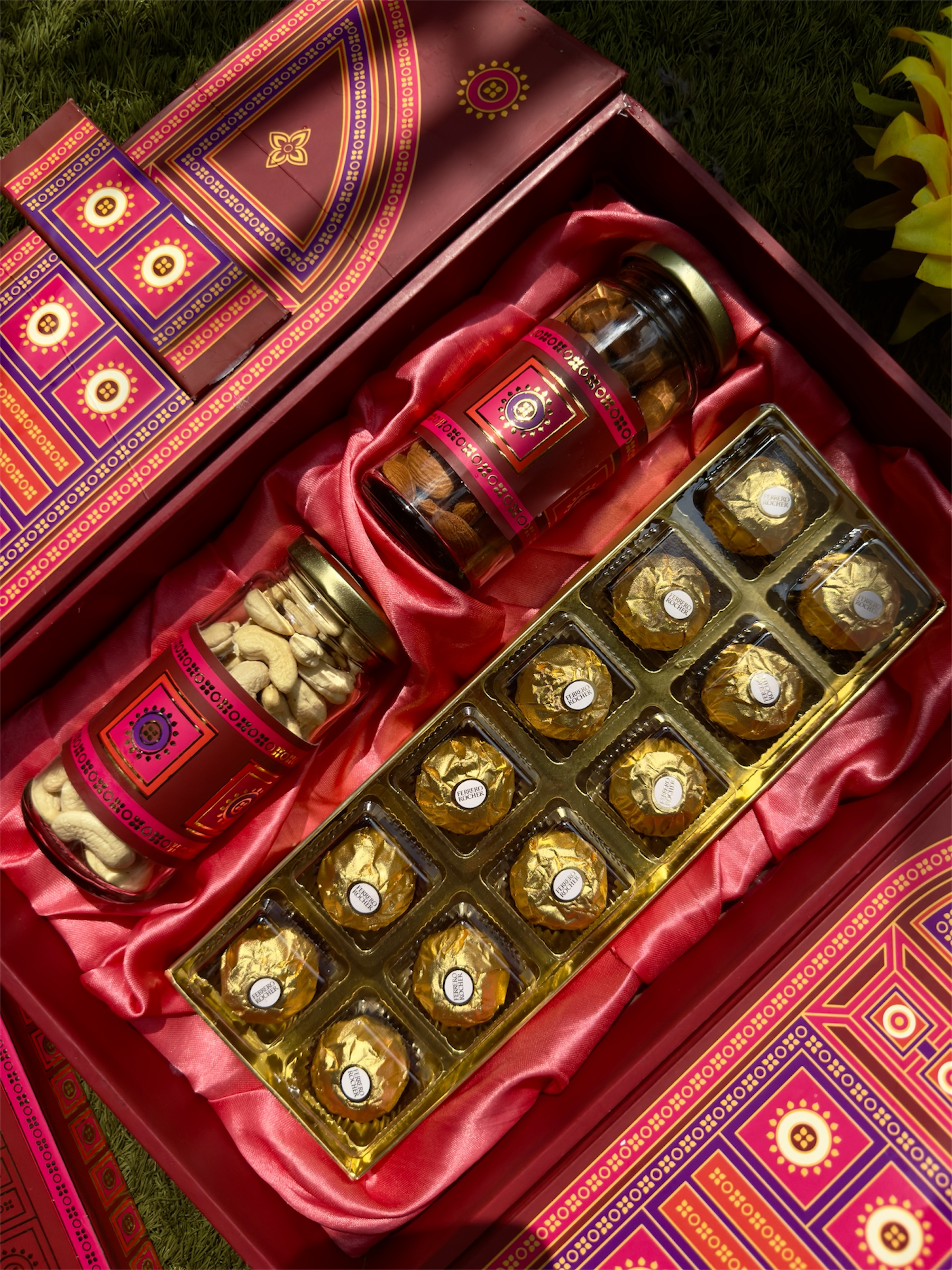 Make this Diwali 2025 truly memorable with the Royal Treasure Box – Festive Delight Hamper, a perfect blend of luxury, taste, and festive cheer. This premium Diwali hamper is curated with Ferrero Rocher chocolates and handpicked dry fruits – ideal for family, friends, and corporate gifting.