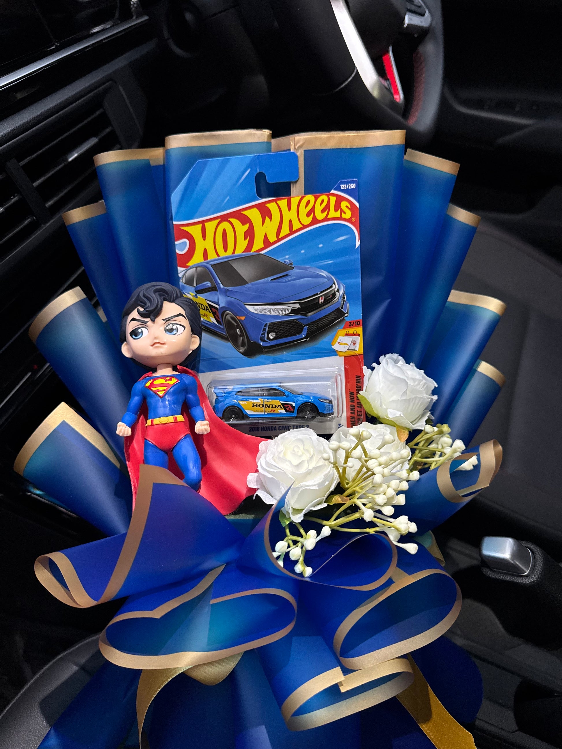 The Superman Hot Wheels Bouquet (2018 Honda Civic Type-R) is a premium collectible-themed gift designed for superhero fans, Hot Wheels collectors, and car lovers. This handcrafted bouquet features a packaged Hot Wheels 2018 Honda Civic Type-R positioned at the center (car model may depend on availability) paired with a Superman figurineplaced on top, giving the arrangement a bold, themed presentation. Styled using blue-and-white bouquet wrapping sheets, artificial roses, and white floral buds, it delivers a clean and premium gift aesthetic.