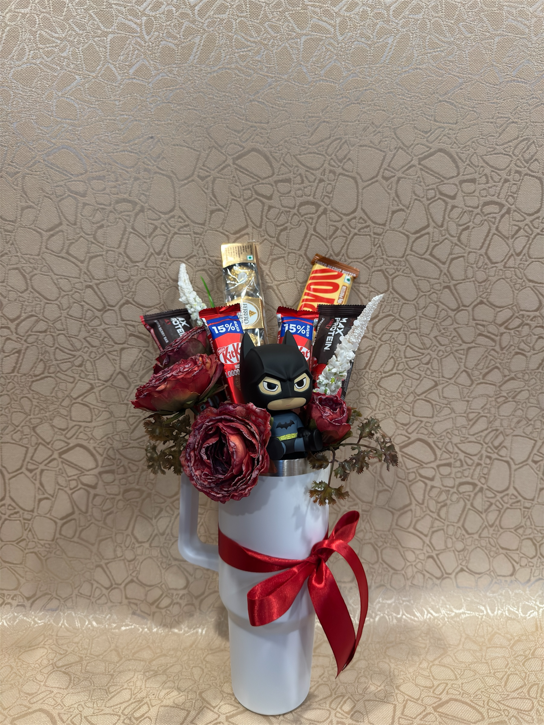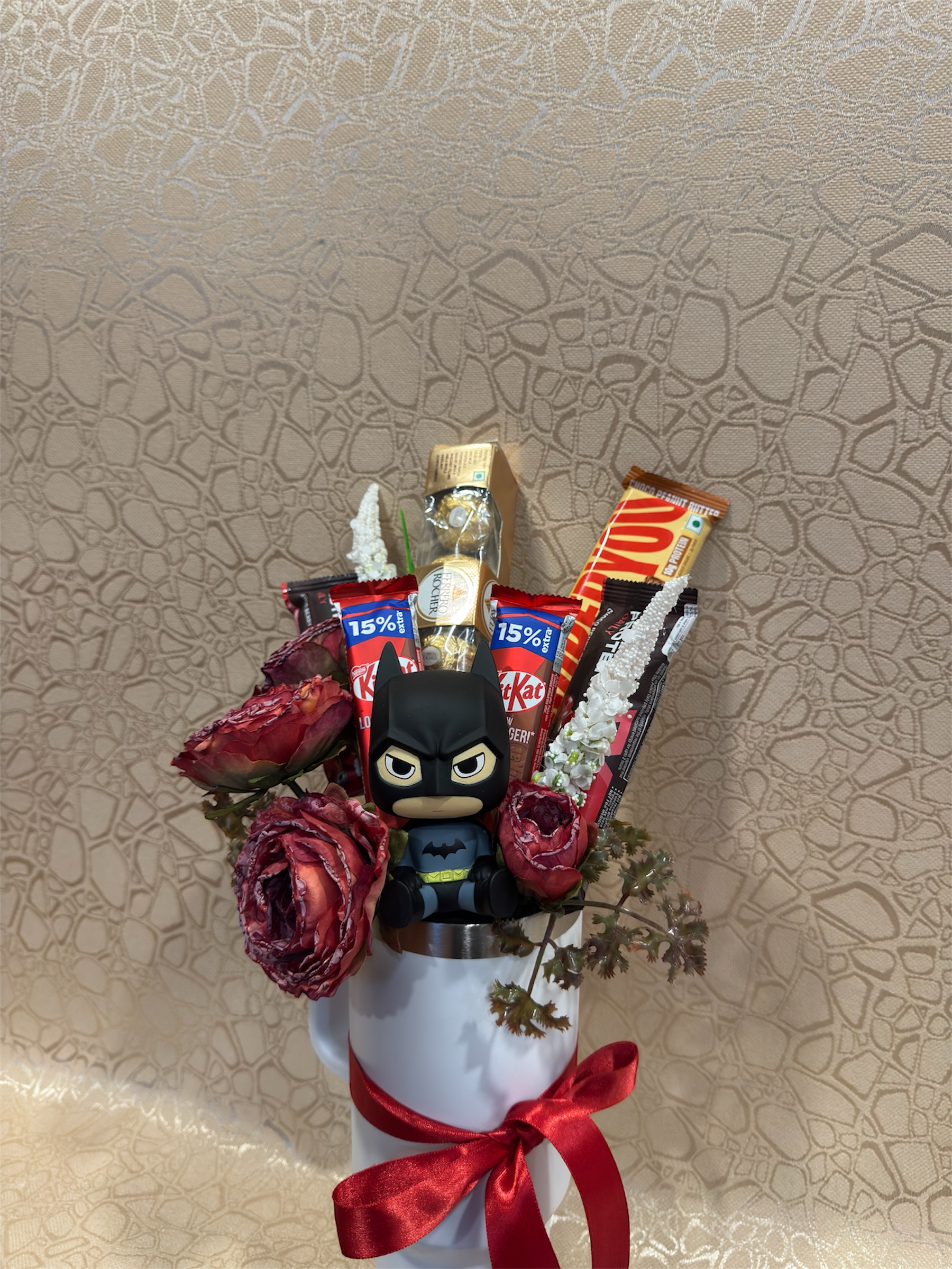 Surprise your loved ones with our White Tumbler Gift Set featuring a Batman bobblehead, KitKat, Ferrero Rocher, SuperYou wafers, protein bars, and red artificial roses – perfect for any occasion!