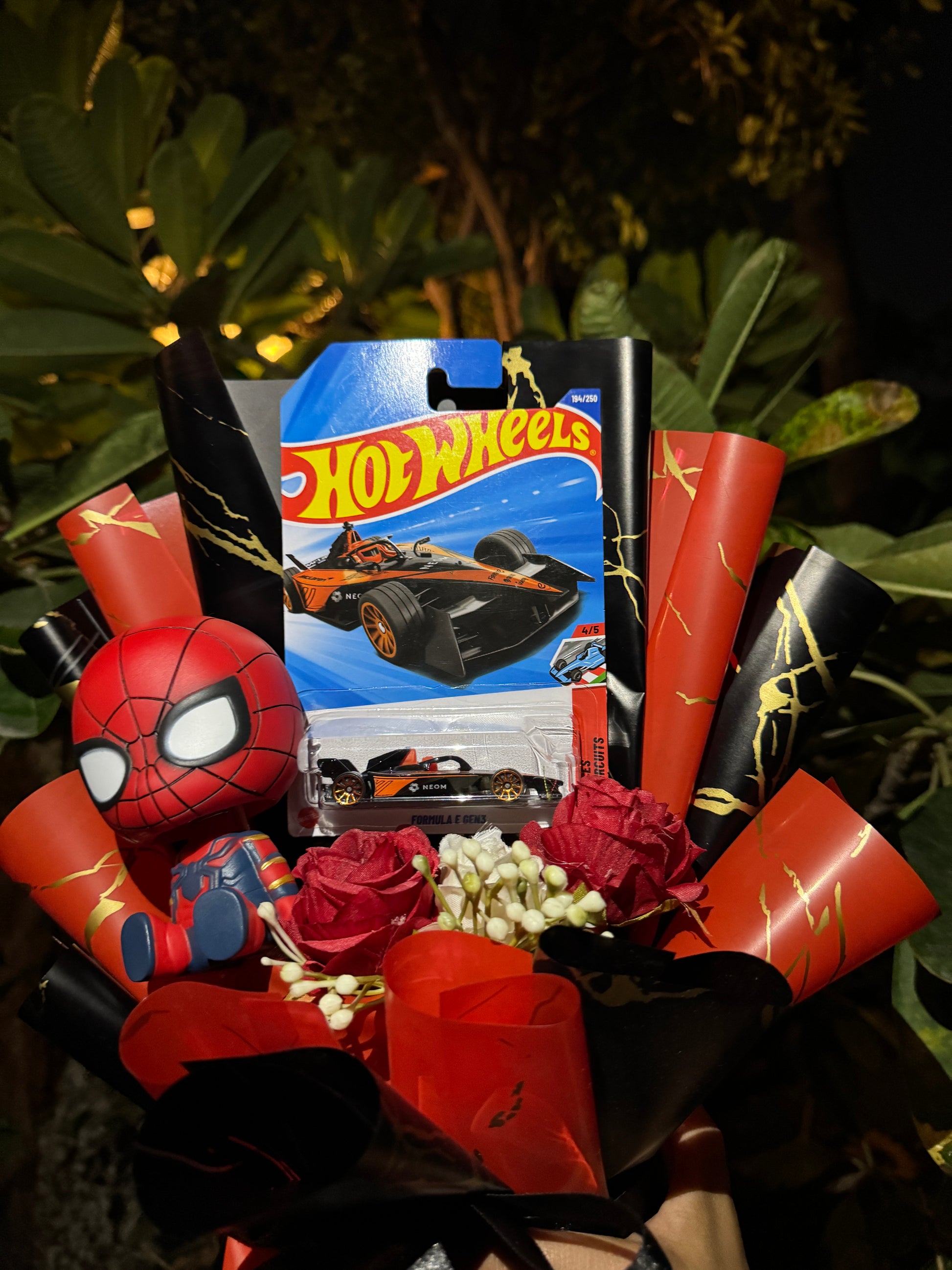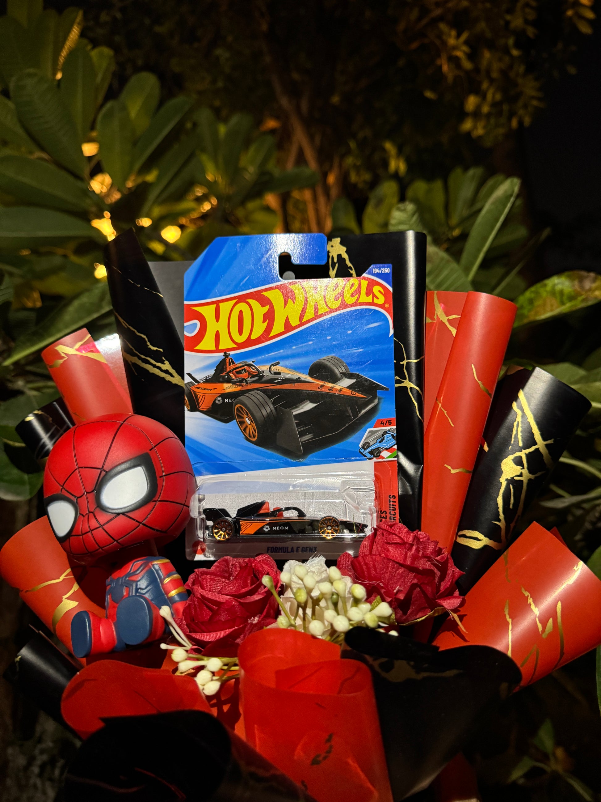 A striking fusion of speed, strength, and superhero energy. This premium bouquet features the Hot Wheels Formula E Gen 3 race car collectible, paired with a bold Spider-Man bobblehead, surrounded by rich red artificial roses and detailed filler flowers. Wrapped in dramatic red-and-black designer sheets with gold accents, this arrangement delivers a powerful visual impact.