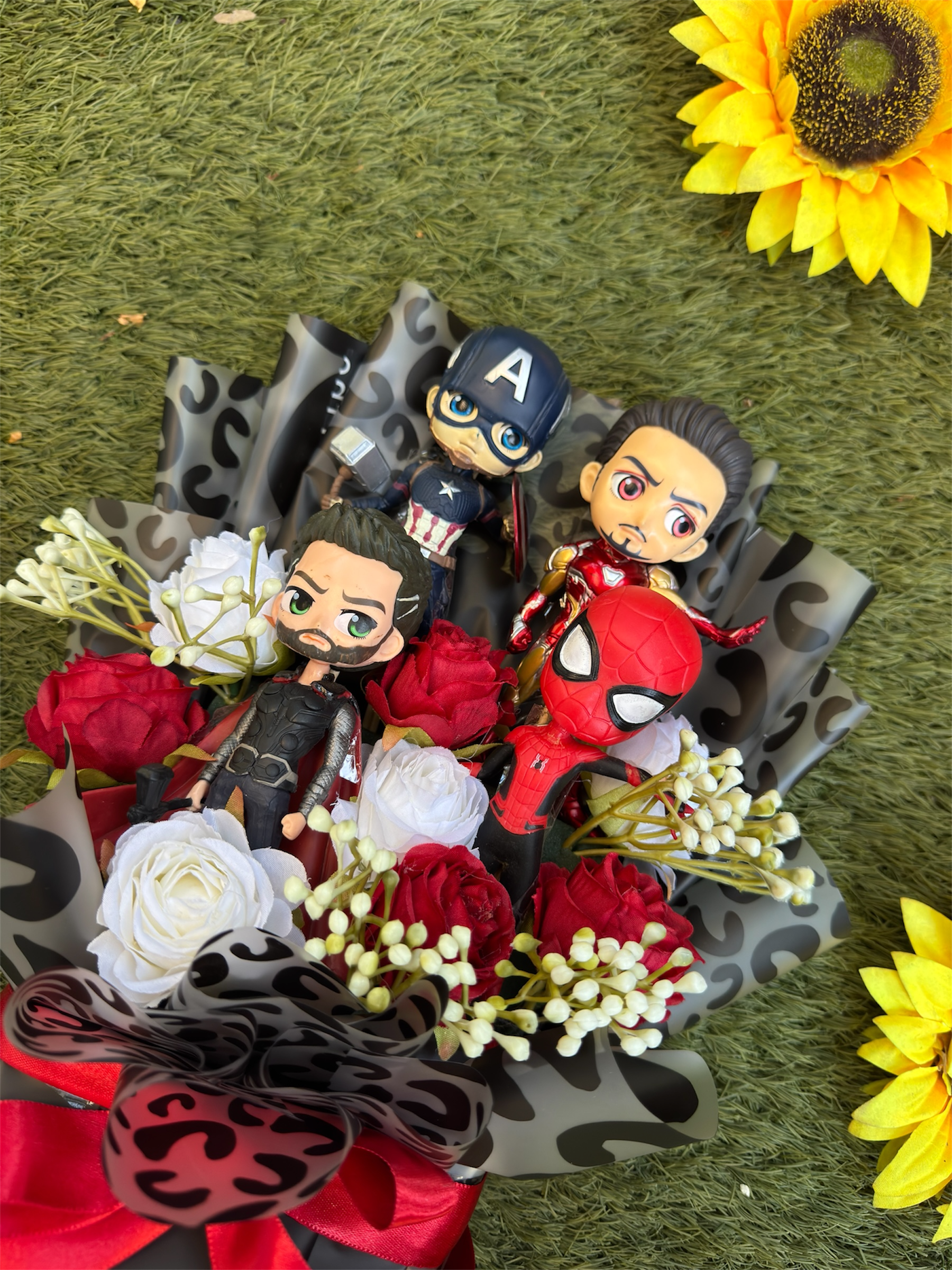Experience a bold fusion of luxury gifting and iconic fandom with our Marvel Signature Hero Bouquet, a rare and striking arrangement featuring four legendary Marvel action figures — Spider-Man, Iron Man, Captain America, and Thor.