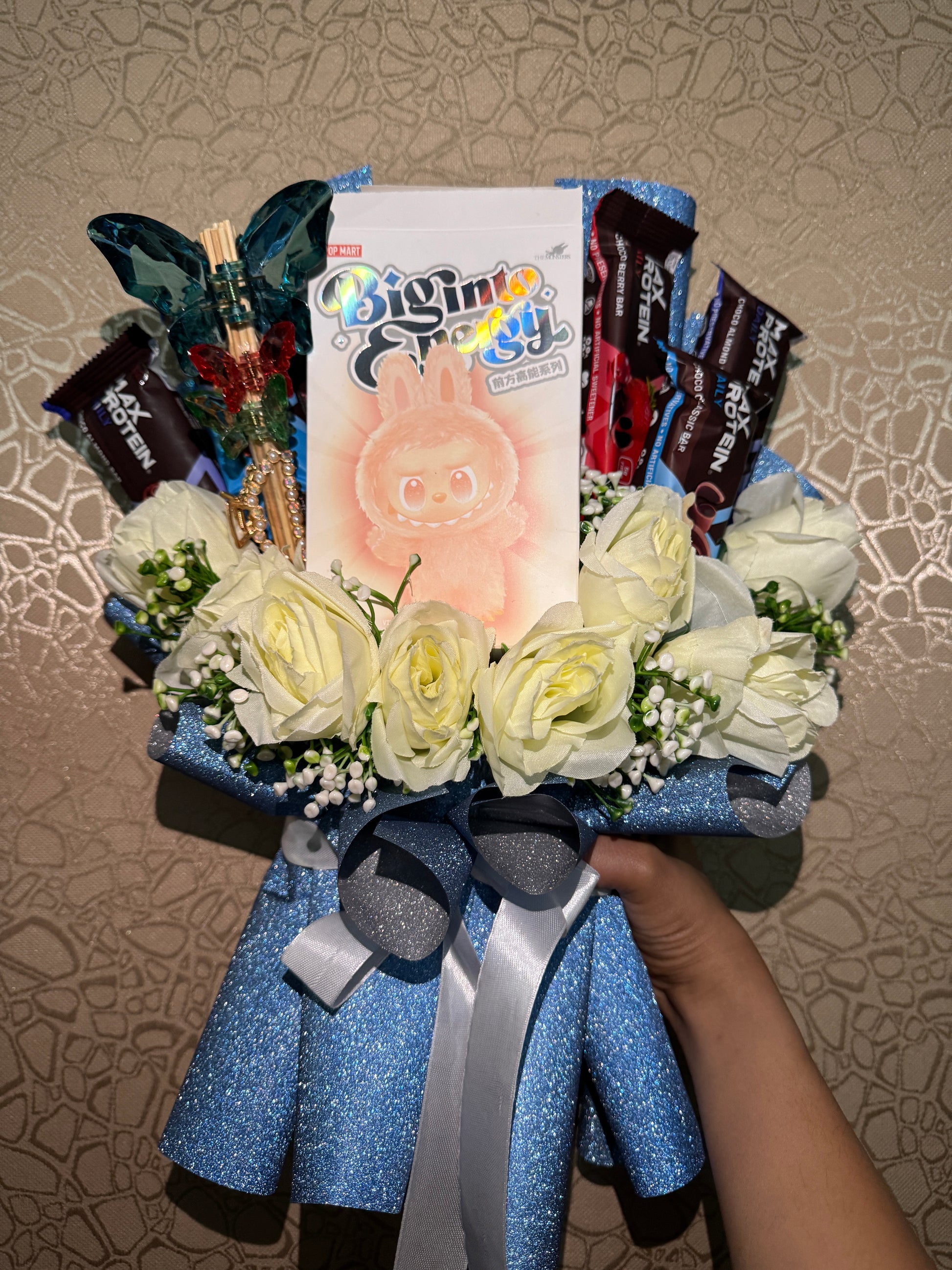 Surprise someone special with this unique Protein Bouquet, blending fitness and elegance. Wrapped in a sparkling blue sheet, it features 5 Max Protein Bars for energy, a playful Labubu figurine, a delicate butterfly accent, and white artificial roses for a timeless touch.