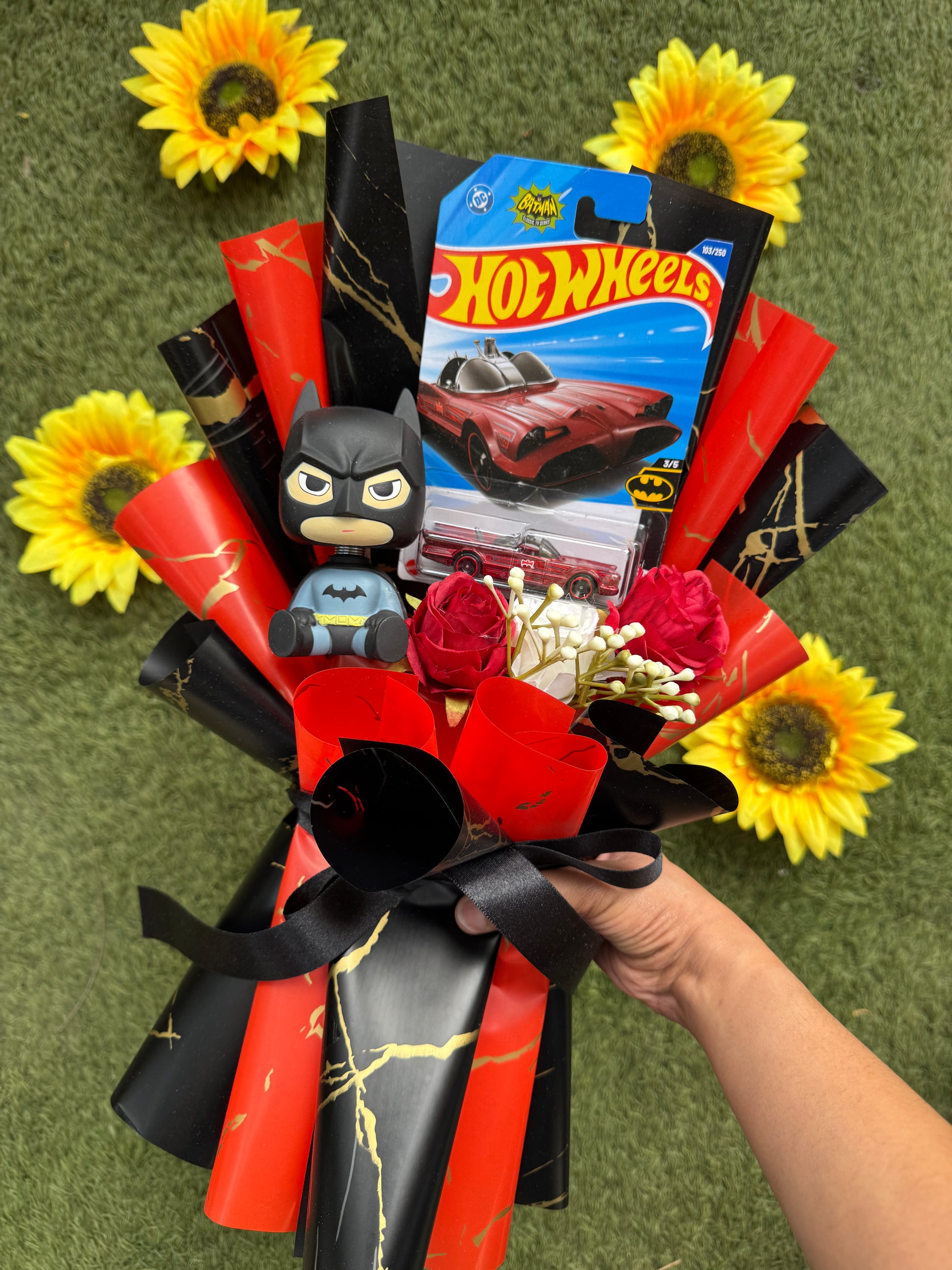 This exclusive bouquet features the legendary Hot Wheels Red TV Series Batmobile, a collector’s favorite, paired with a stylish Batman figurine and wrapped beautifully in bold red and black luxury paper. Designed to stand out, this bouquet is more than a gift—it’s a statement.