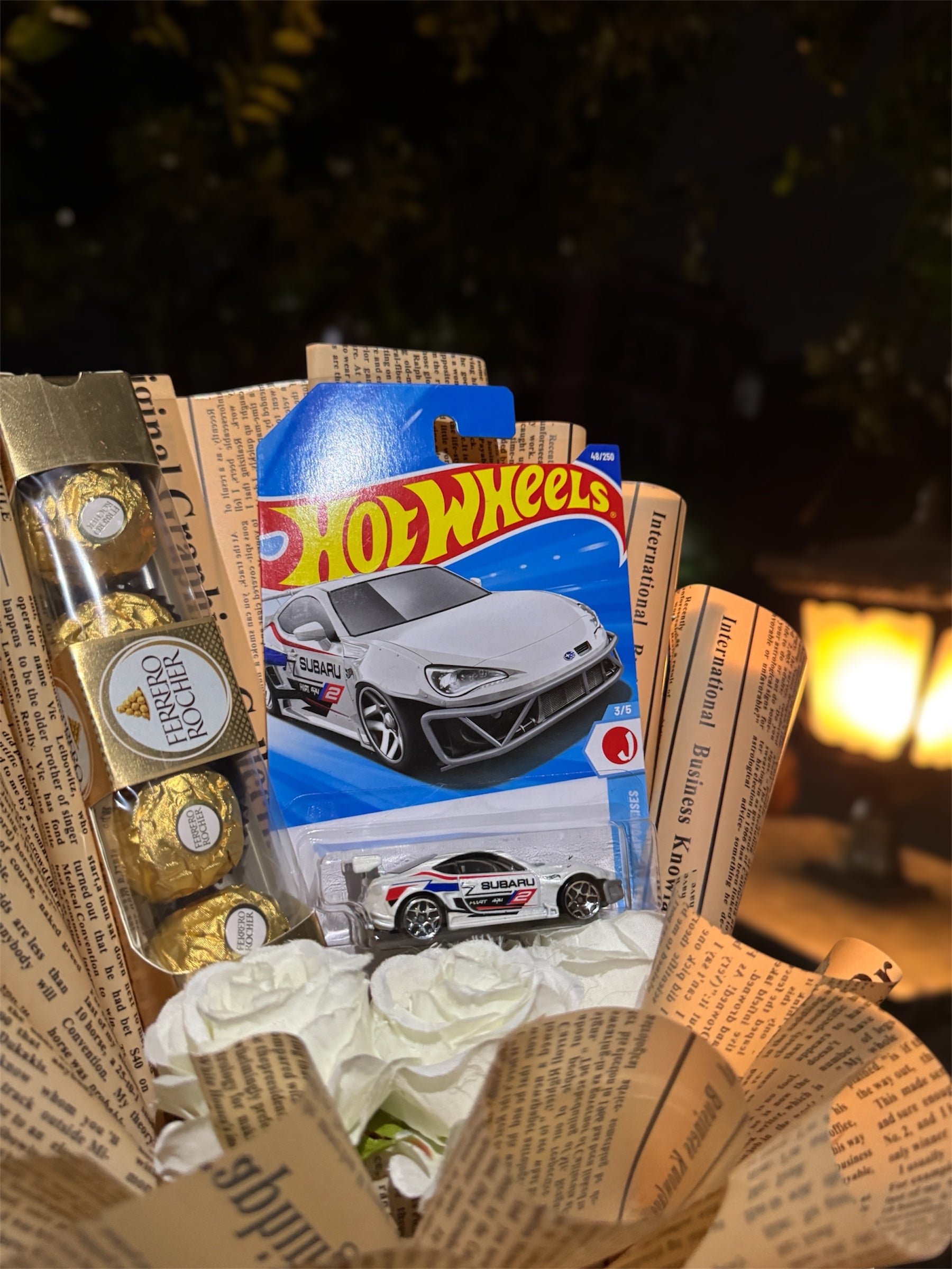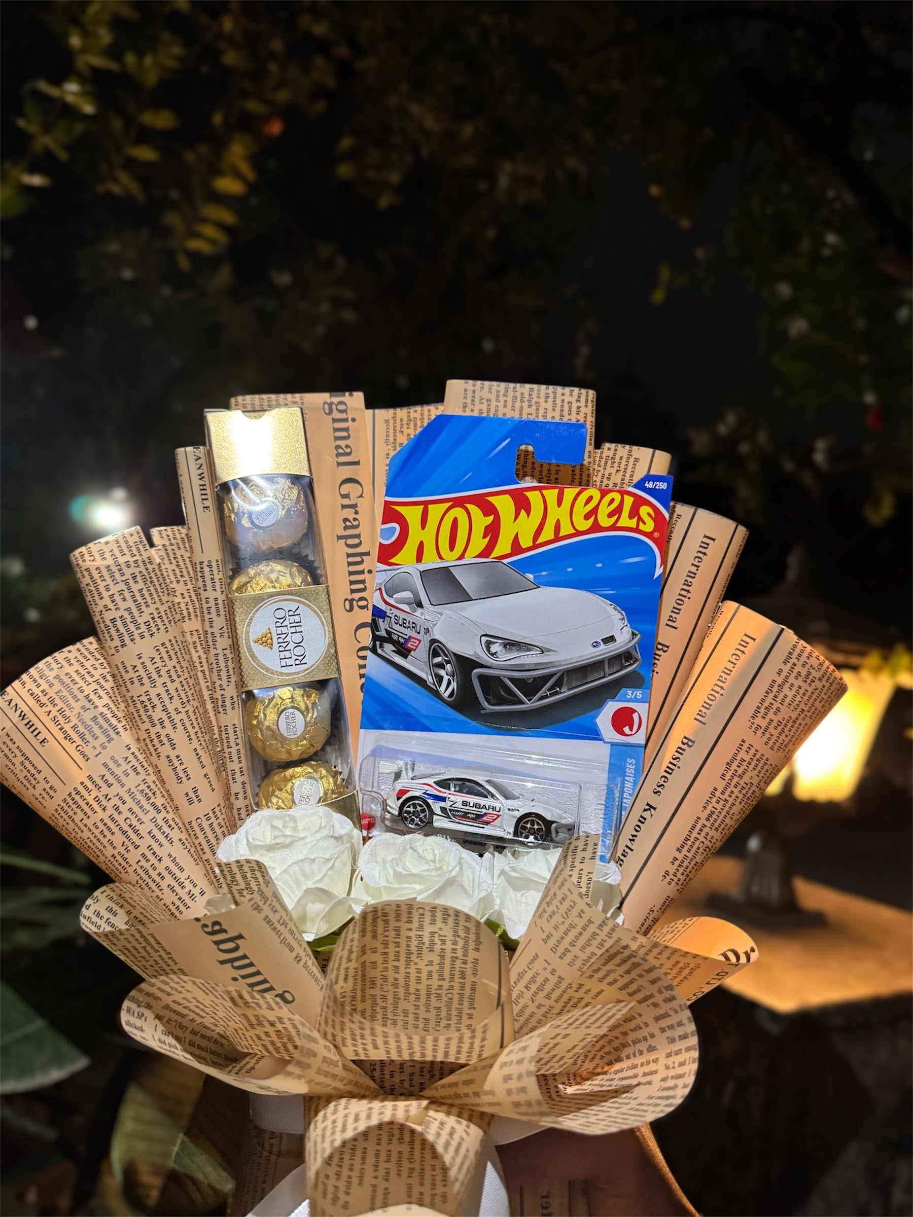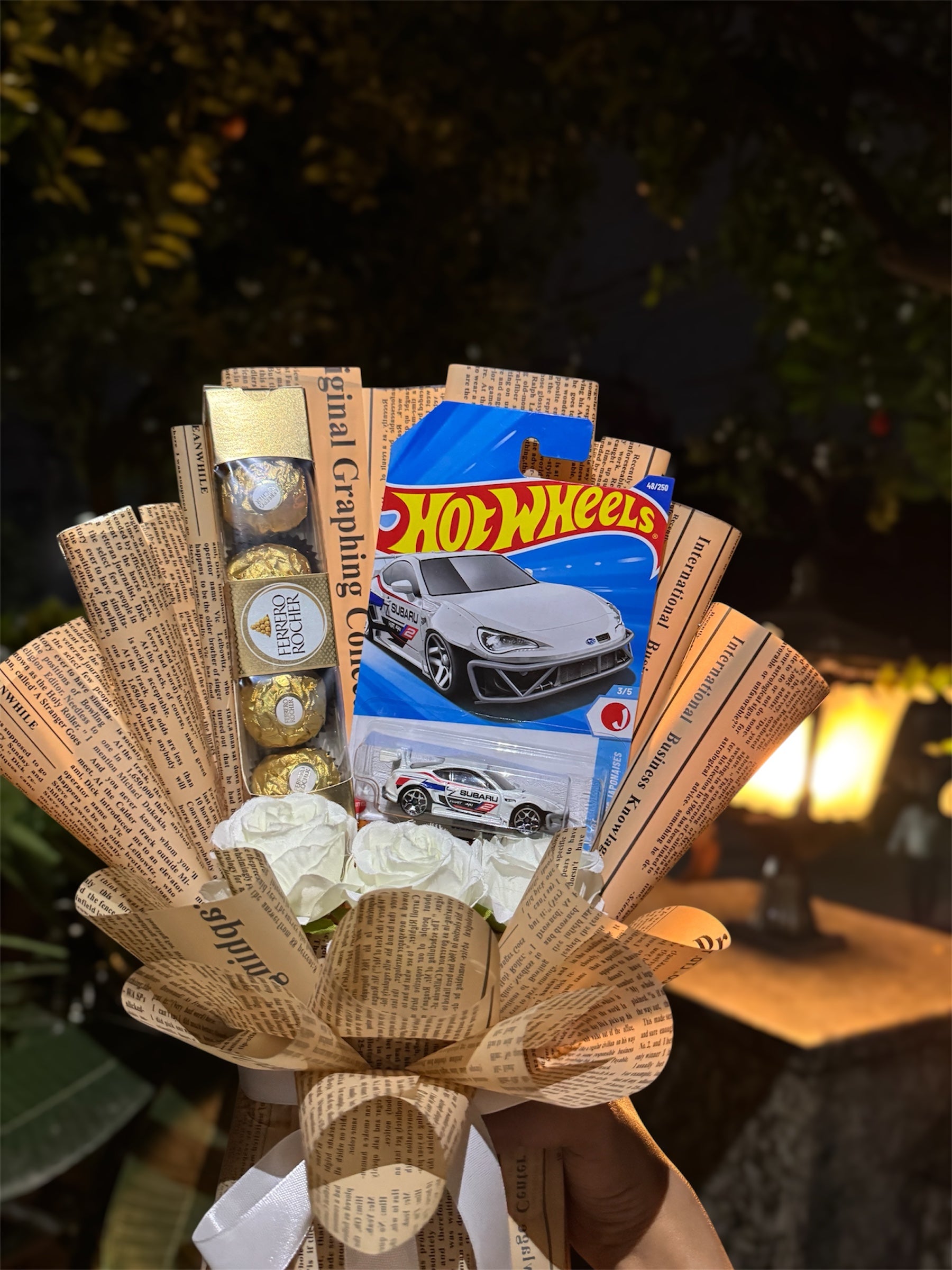 Celebrate timeless elegance with our Vintage Luxe Bouquet, a perfect blend of collectible Hot Wheels, luxurious Ferrero Rocher chocolates, and elegant white flowers – all wrapped in a rustic yet premium brown newspaper-style wrapping.