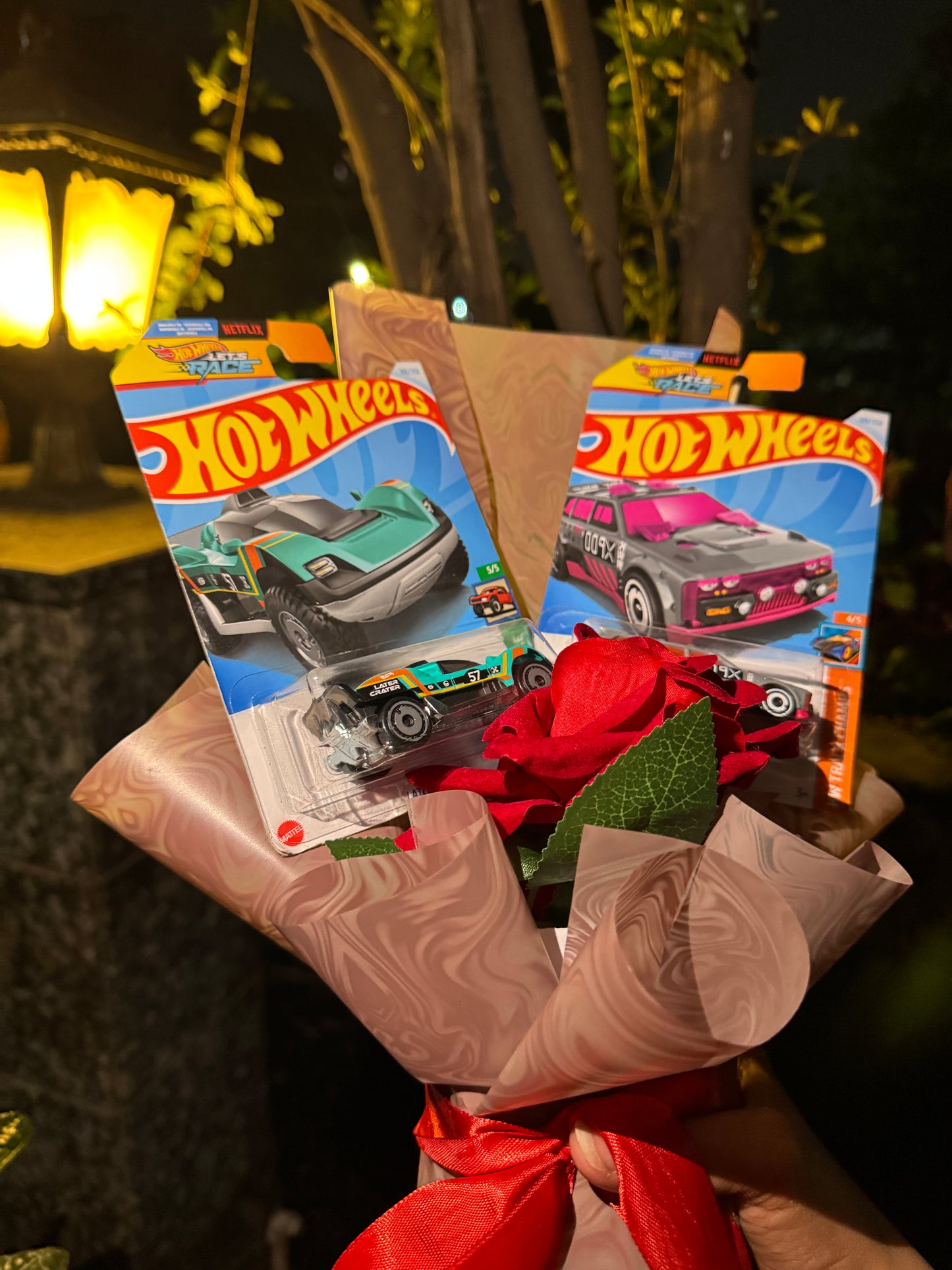 Gift a bouquet that never fades with our Everlasting Roses and Hot Wheels Bouquet unique blend of timeless beauty and high-speed excitement! This handcrafted arrangement features premium Hot Wheels cars, paired with stunning artificial roses that last forever, making it the perfect gift for car enthusiasts, collectors, and thrill-seekers.