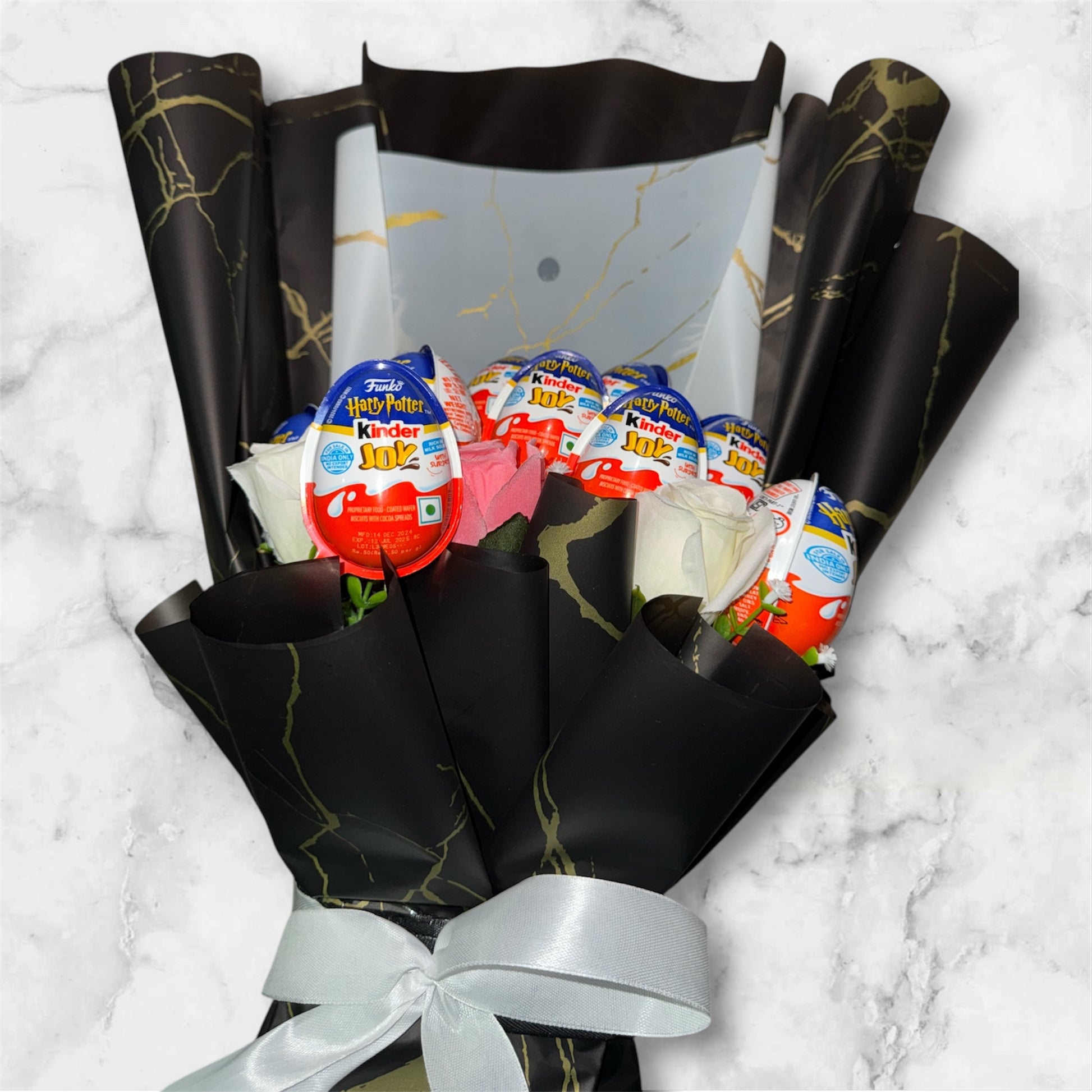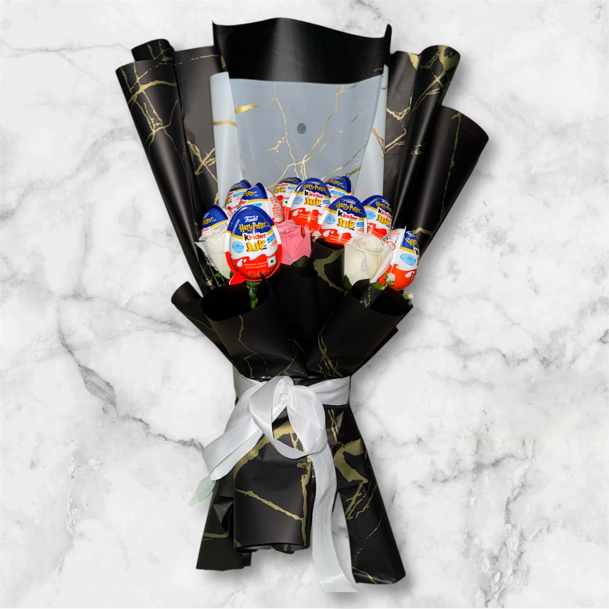 The Harry Potter Kinder Joy Bouquet - Black is a perfect blend of magic and sweetness, designed to delight Harry Potter fans and chocolate lovers alike. Featuring a selection of Harry Potter-themed Kinder Joy, this unique bouquet is elegantly wrapped in luxurious black paper with gold accents and finished with a white satin ribbon. Accentuated by delicate faux flowers, it makes for an enchanting and sophisticated gift. Whether it’s a birthday, anniversary, or just a sweet surprise, this bouquet is sure to bring joy and a touch of wizardry to any special occasion. Treat your loved ones to this magical indulgence today.